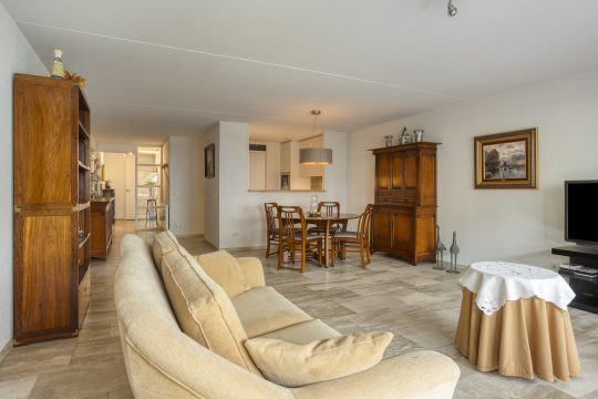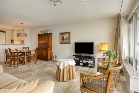 Vanuit de woonkamer is er middels de schuifpui toegang tot het balkon (ca. 15 m²) welke is gesitueerd op het zonnige zuiden en hier geniet u van een mooi uitzicht. Het balkon is voorzien van terrastegel, buitenverlichting, elektra en zonneluifel (scherm vernieuwd in 2024).