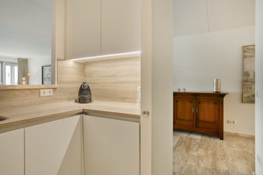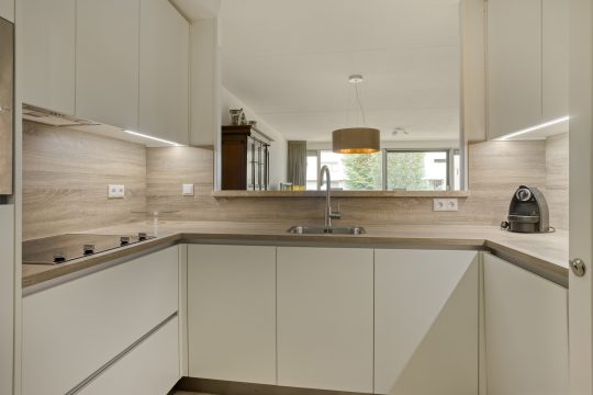Half open en moderne keuken welke in 2020 is vernieuwd. De keuken is geplaatst in een U-opstelling en in lichte kleurstelling. De keuken is voorzien van kunststof werkblad, inductie kookplaat, rvs spoelbak, koelkast, combimagnetron/-oven en diverse boven- en onderkastjes/lades voor meer dan voldoende bergruimte.