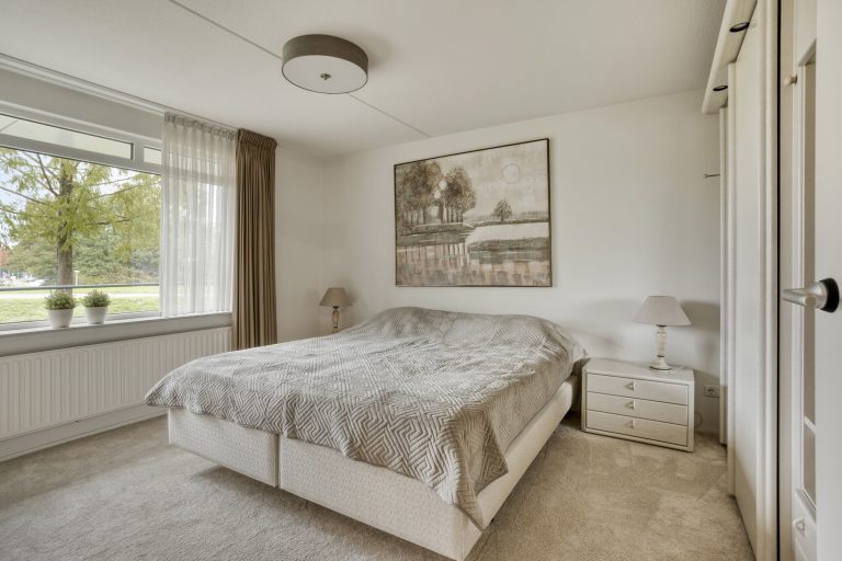 Ruime slaapkamer voorzien van een natuurstenen tegelvloer en tevens voorzien van een raamkozijn met elektrische zonnewering en afgewerkt met spuitwerk wandafwerking en een spuitwerk plafond.
