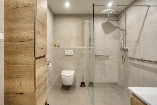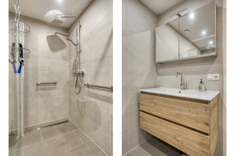 De geheel betegelde en moderne badkamer welke in 2020 geheel is vernieuwd en voorzien van een royale inloopdouche met glazen wand, zwevend toilet, wastafel met bijpassend meubel, designradiator en een stucwerk plafond met inbouwverlichting.