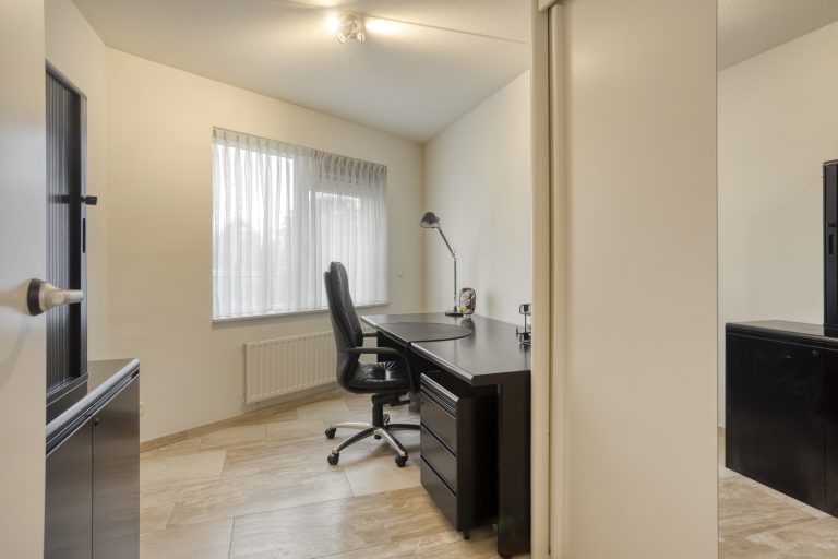Deze kamer is momenteel in gebruik als kantoor/werkkamer en voorzien van een natuurstenen tegelvloer en raamkozijn voorzien van elektrische zonnewering.