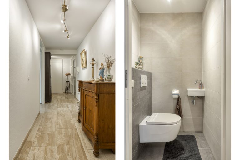 Moderne toiletruimte (vernieuwd in 2020) is geheel betegeld en voorzien van een zwevend toilet, fonteintje en mechanische ventilatie.