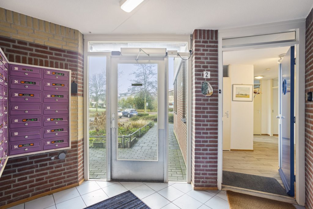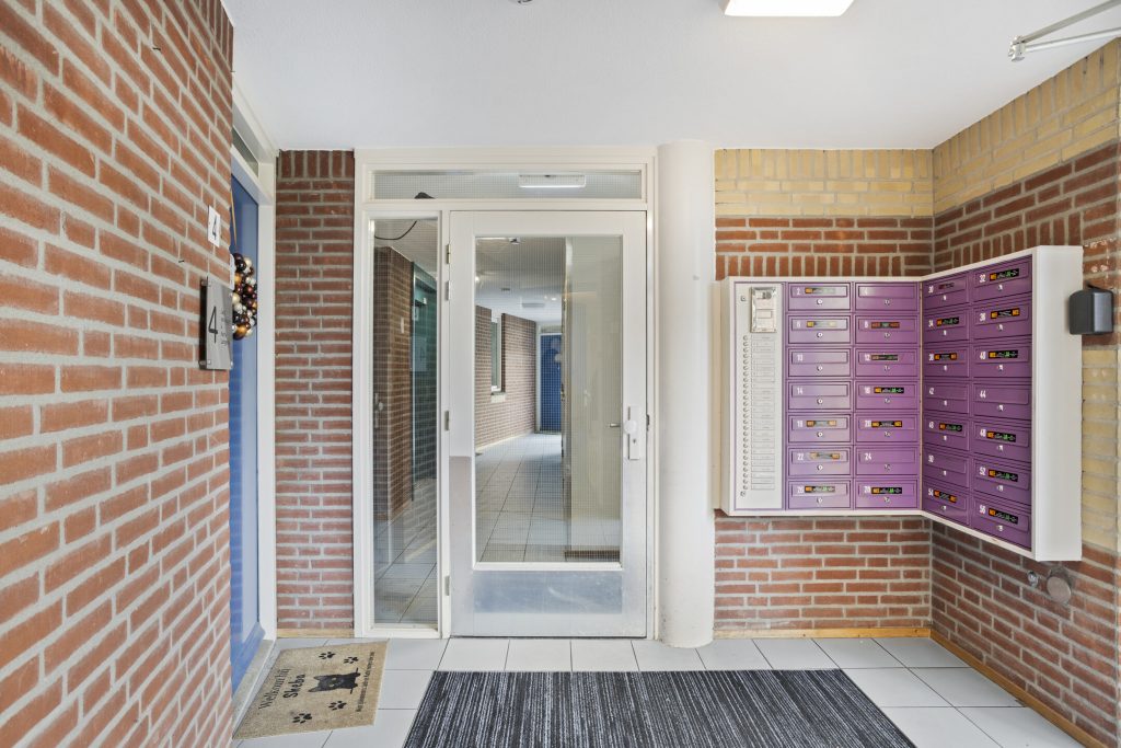 Overdekte, centrale hal met bellentableau (intercom), brievenbussen, lift en trapopgang