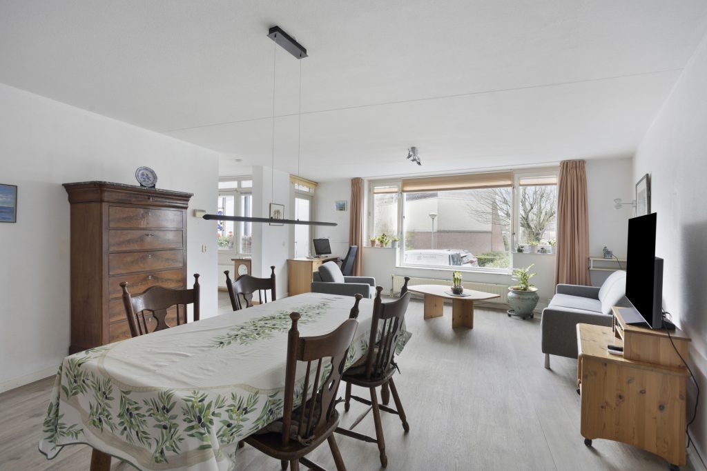 Woonkamer afgewerkt met pvc vloer, spuitwerkwanden en spuitwerkplafond. Deur met toegang tot loggia/tuinkamer.