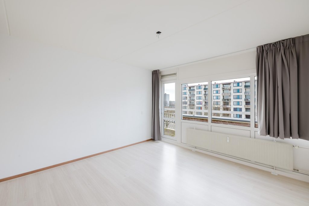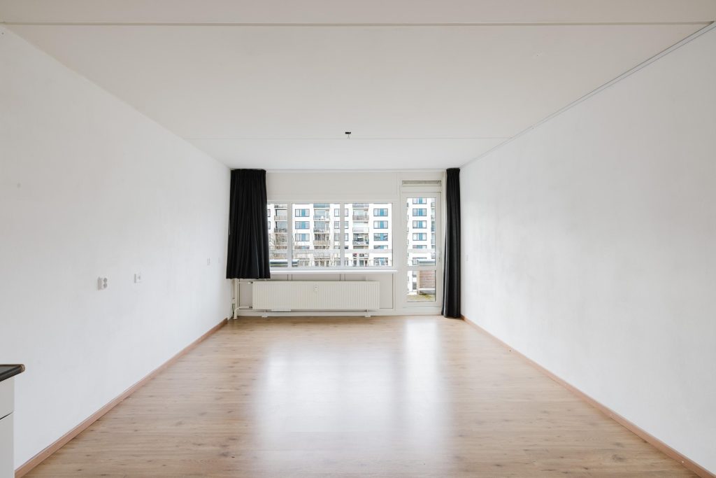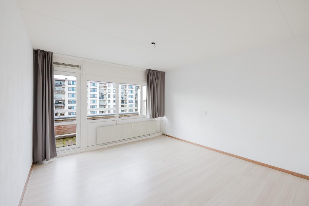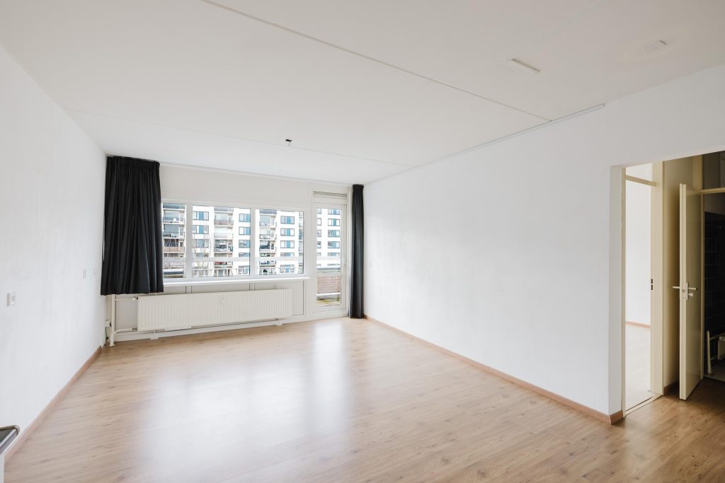 De woonkamer is heerlijk licht dankzij de grote raampartijen en de loopdeur naar het balkon. De ruimte is vrij in te delen en voelt door de hoeveelheid natuurlijk licht ruim en prettig aan.