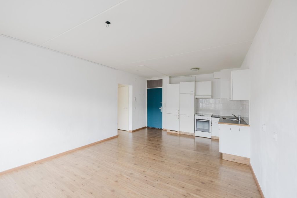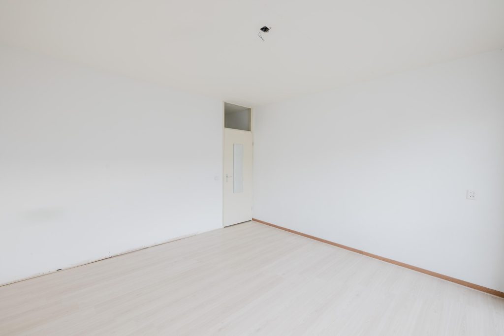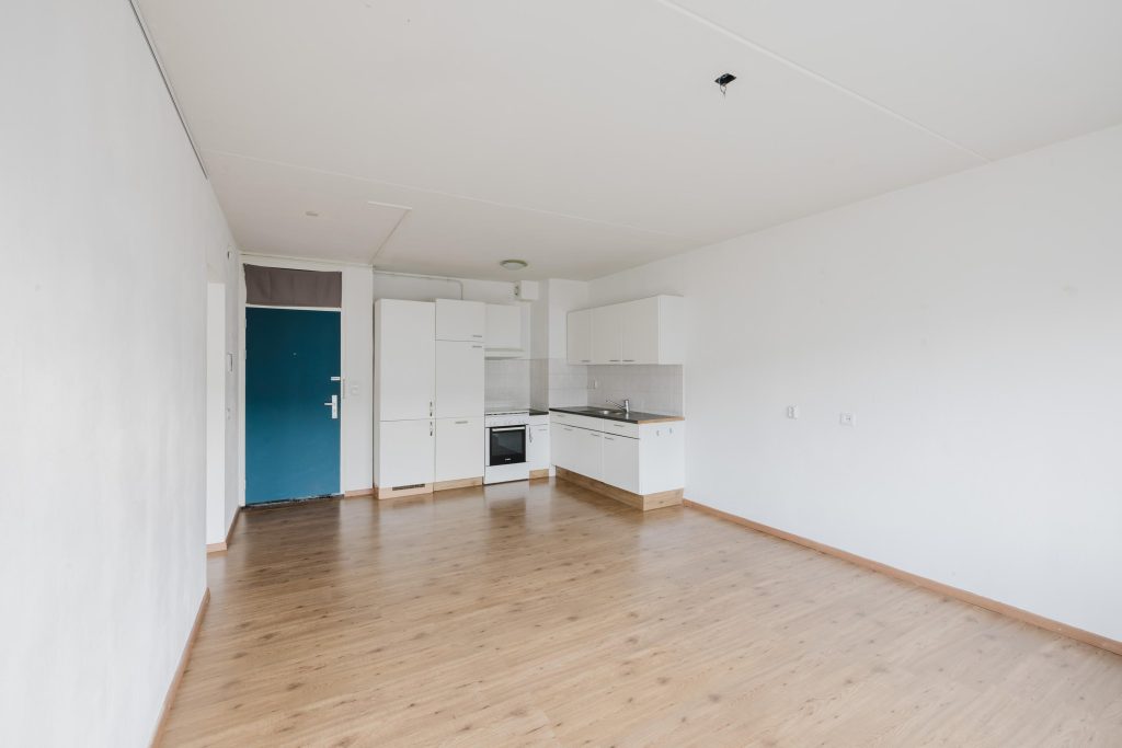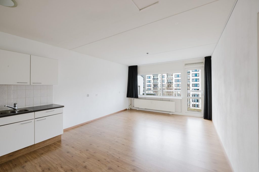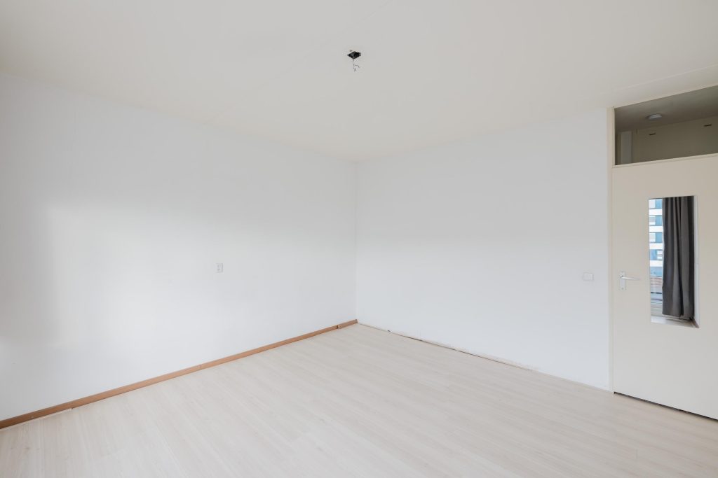 De woonkamer is heerlijk licht dankzij de grote raampartijen en de loopdeur naar het balkon. De ruimte is vrij in te delen en voelt door de hoeveelheid natuurlijk licht ruim en prettig aan.