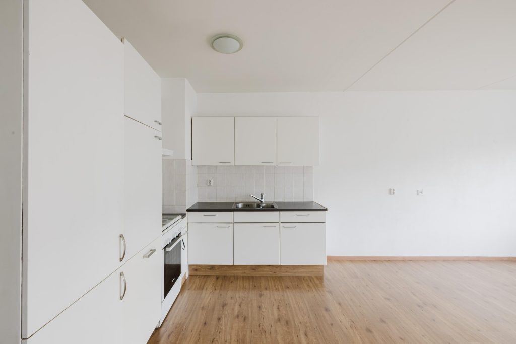 De open keuken bevindt zich in een praktische L-opstelling en is uitgevoerd in een lichte kleurstelling met houtlookdetails in de plinten. De keuken is voorzien van diverse (inbouw) apparatuur, waaronder een koelkast, losse oven met gaskookplaat en spoelbak. Er is voldoende werk- en bergruimte, waardoor koken hier comfortabel en overzichtelijk is.