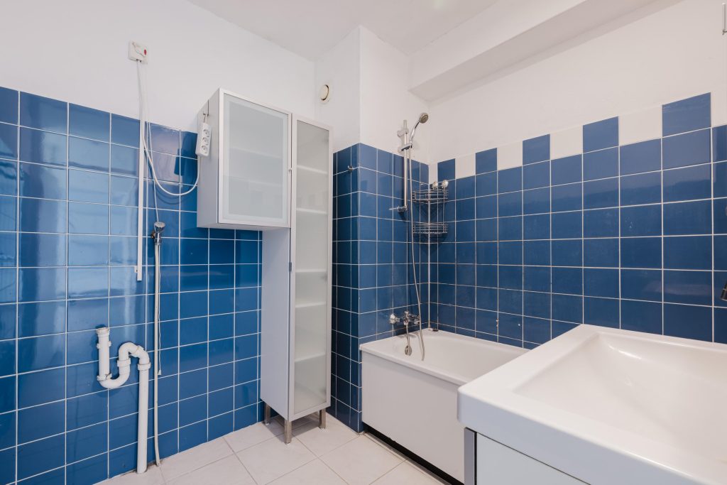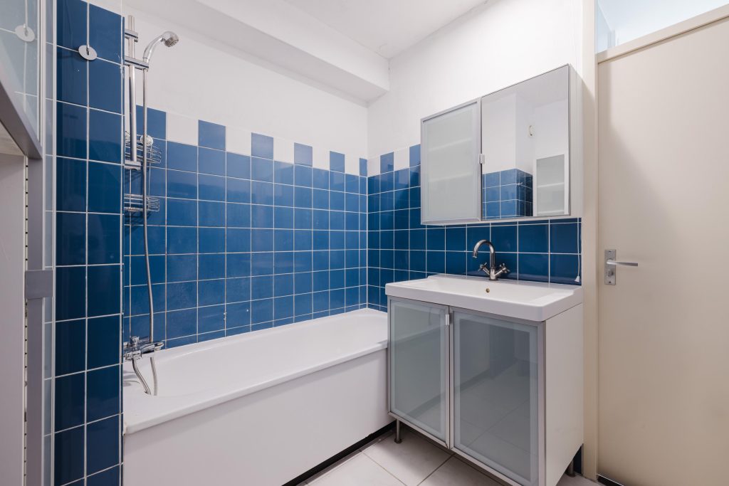 De badkamer is voorzien van een bad met douche, wastafel met bijpassend meubel en een spiegelbovenkast, 2 bijpassende opbergkasten, radiator en aansluiting voor de wasmachine.