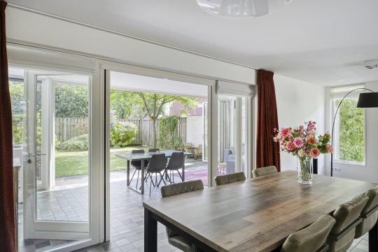De royale L-vormige woonkamer heeft een prettige lichtinval door de grote raampartijen en biedt aan de voorzijde een mooi vrij uitzicht zonder directe overburen. Aan de achterzijde grenst de open eetkamer, die via openslaande deuren toegang geeft tot de moderne tuinkamer die middels de harmonicadeur over de volle breedte direct bij de tuin wordt betrokken. De gehele begane grond is afgewerkt met een tegelvloer en strak stucwerk wand- en plafondafwerking.