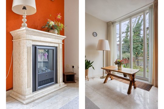 Vanuit de hal komt u de woonkamer binnen, welke is afgewerkt met een marmeren tegelvloer en vloerverwarming. Optimaal lichtinval middels plafondhoge raampartijen in voorgevel, zijgevel en achtergevel.
