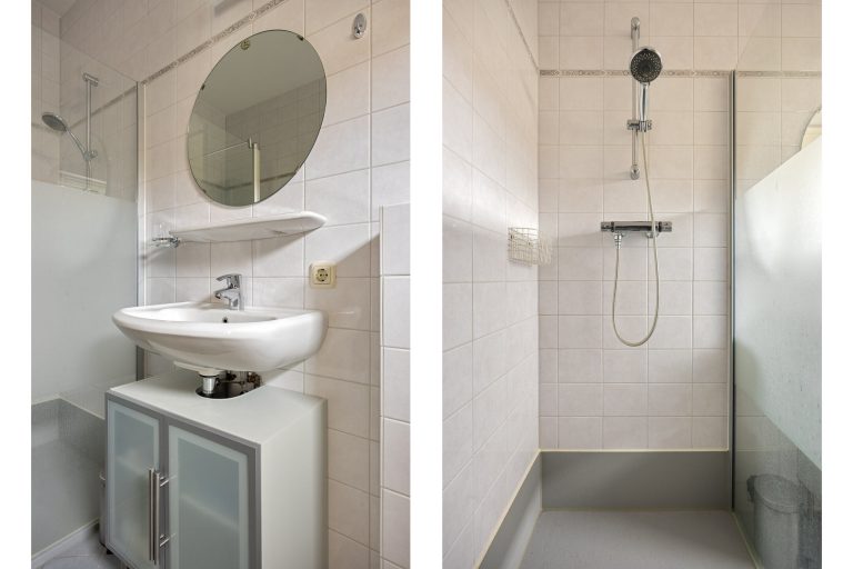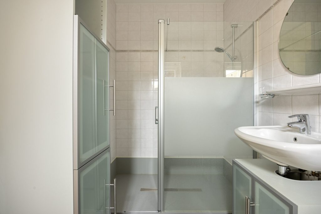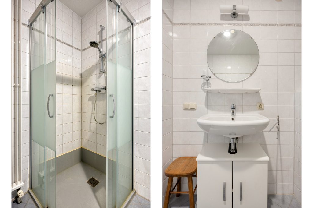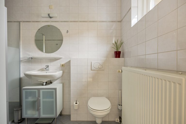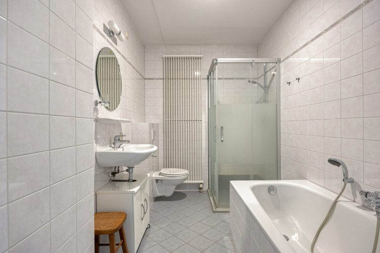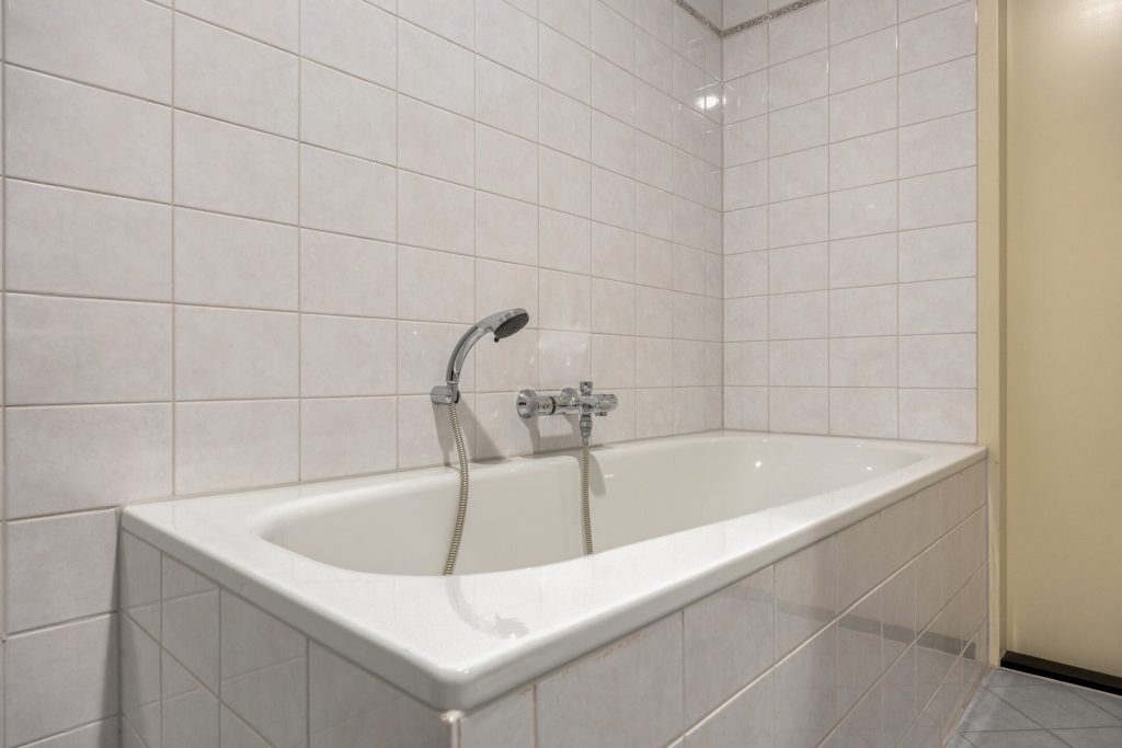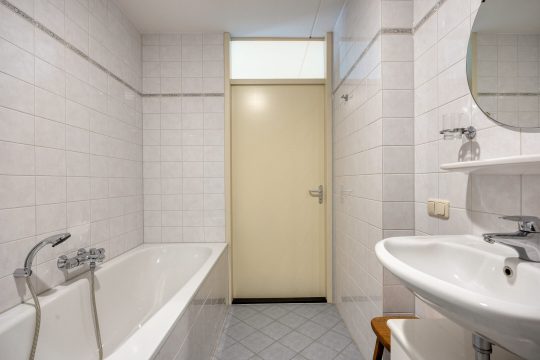 Volledig betegelde badkamer, voorzien van wastafel, ligbad met thermostaatkraan, douchecabine met thermostaatkraan, hangend toilet, design radiator en mechanische ventilatie.