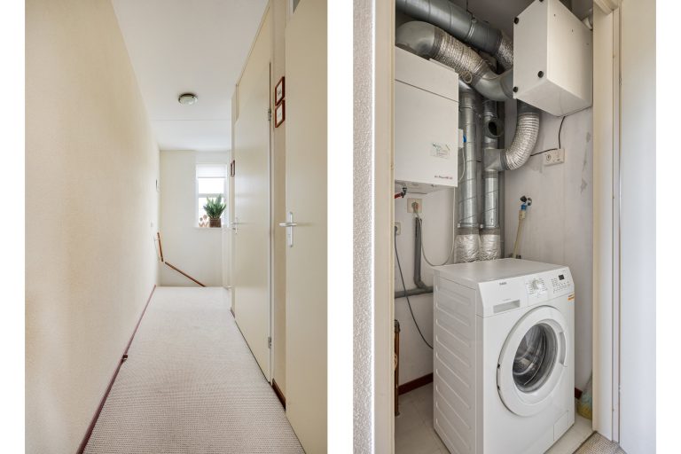 Vanuit de overloop toegang tot een kast met daarin de opstelling was-apparatuur, WTW-unit en mechanische ventilatie unit.