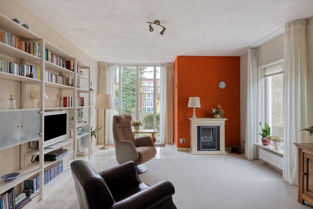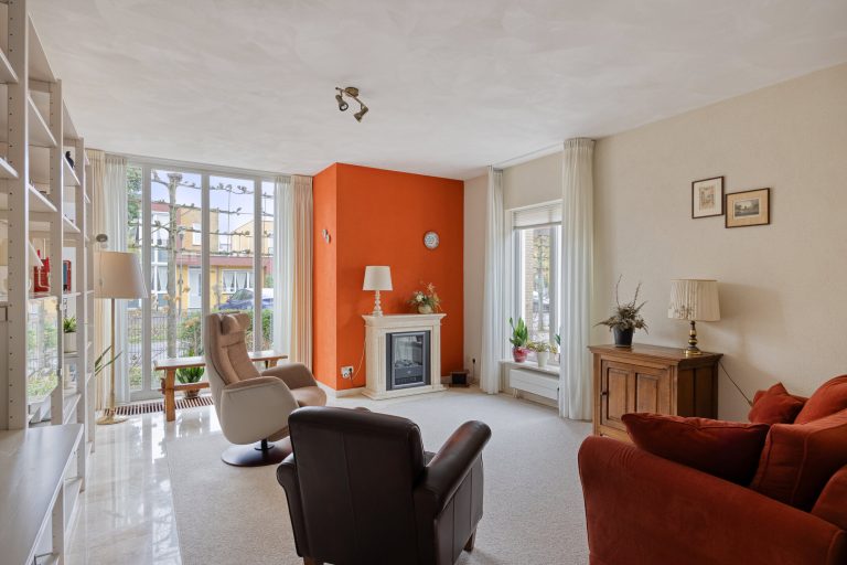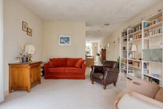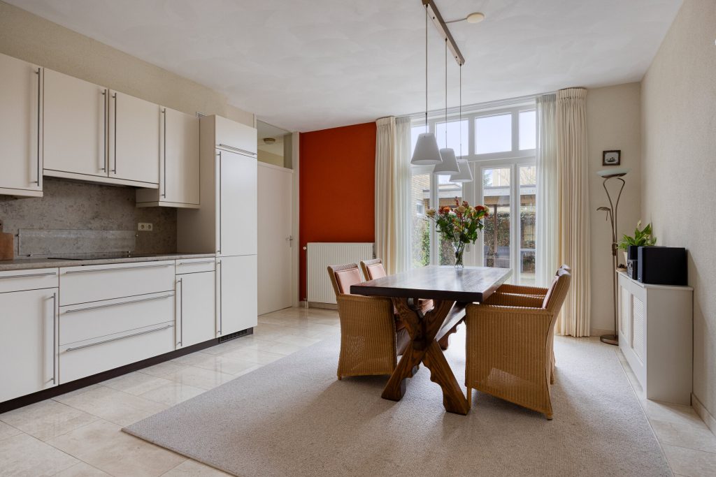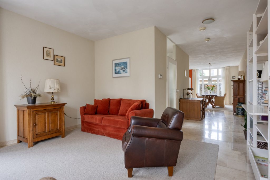 De woonkamer vormt het hart van de woning: een lichte, ruime leefruimte met zitgedeelte aan de voorzijde, eetgedeelte aan de achterzijde en aangrenzend de open keuken. Openslaande tuindeuren verbinden de keuken met de zonnige achtertuin.