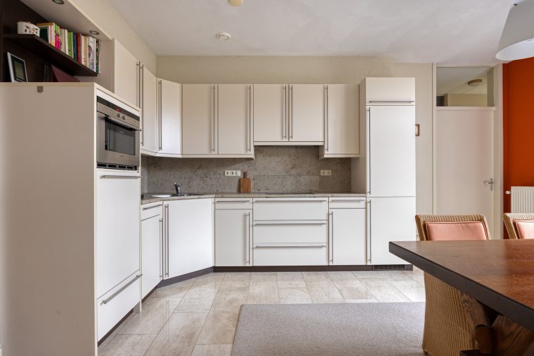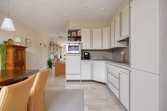 Open keuken in hoekopstelling met kunststof werkblad, meer dan voldoende boven- en onderkasten en laden. De keuken is voorzien van een 4-pits inductiekookplaat, afzuigkap, 1,5 spoelbak, vaatwasser op hoogte, combi-oven, koelkast en vriezer.
