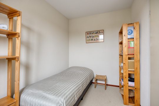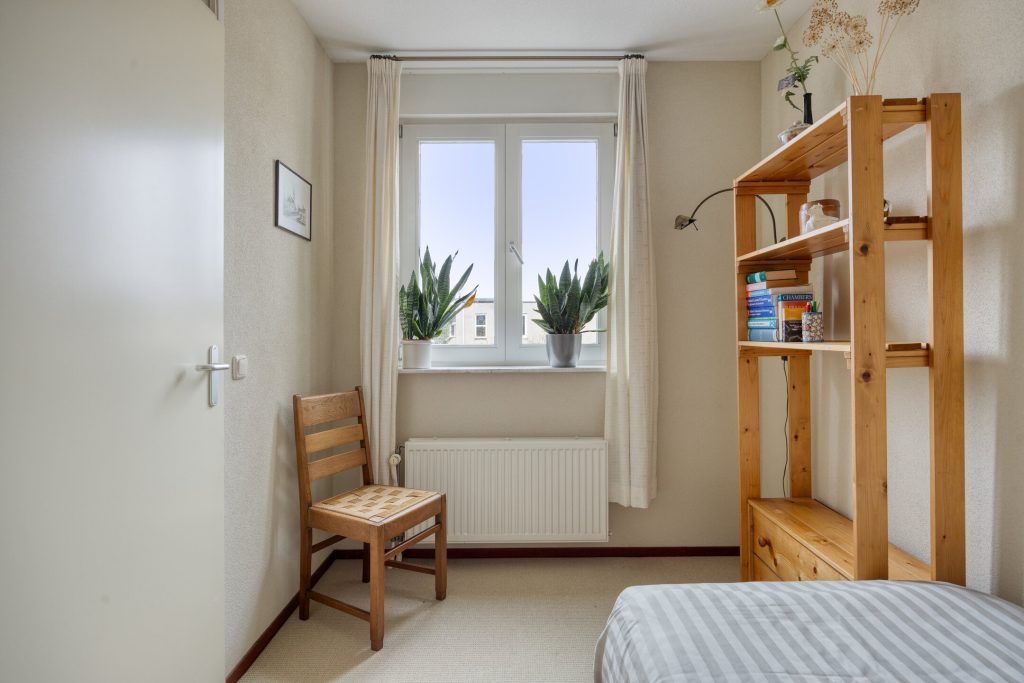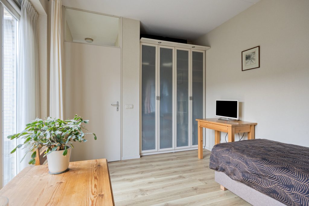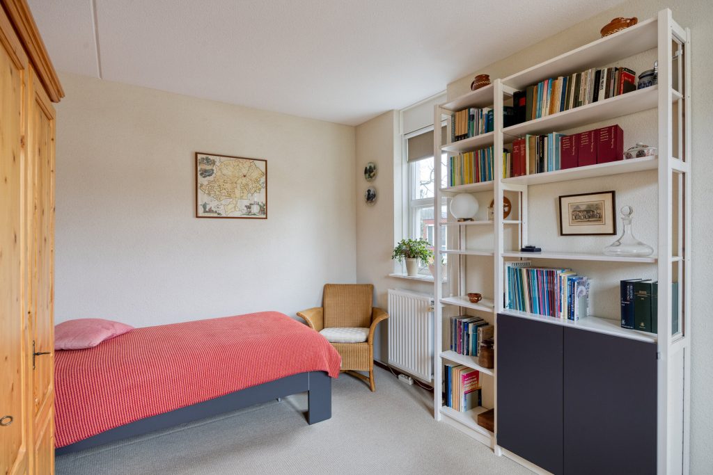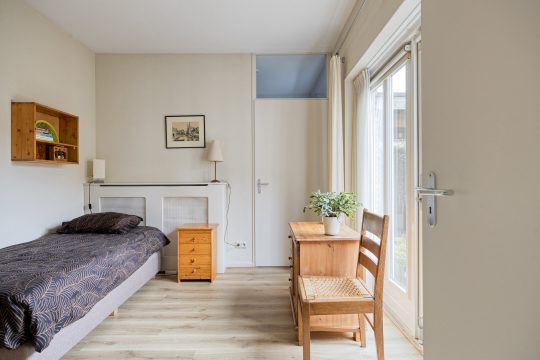 In de slaapvleugel op de begane grond bevindt zich de eerste slaapkamer, voorzien van een laminaatvloer en dubbele tuindeuren.