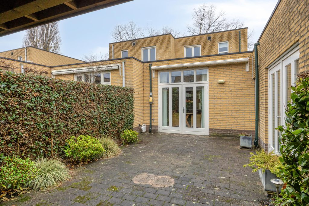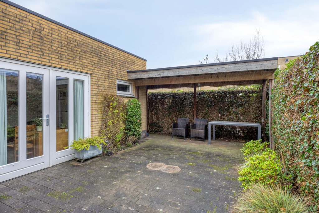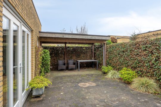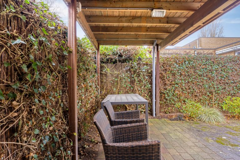 Verzorgde, geheel omsloten achtertuin op het Zuiden, voorzien van sierbestrating, bordes, houten overkapping en een elektrische zonneluifel.