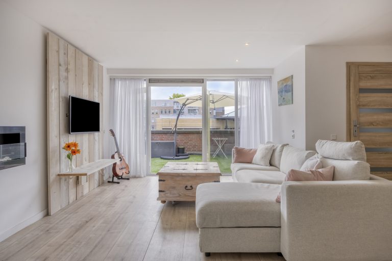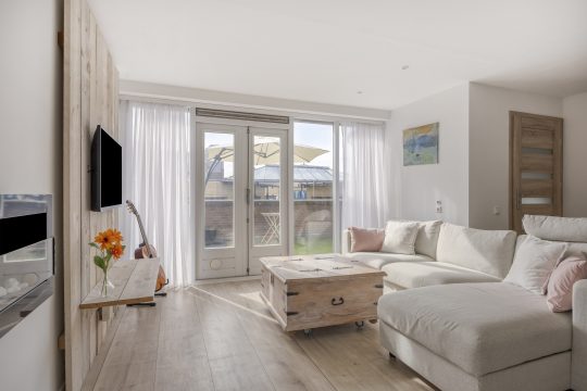 Sfeervolle woonkamer met openslaande terrasdeuren en ruim zicht op het dakterras; de woonkamer is afgewerkt met een fraaie laminaatvloer met laminaatvloer en stucwerk wand- en plafondafwerking.