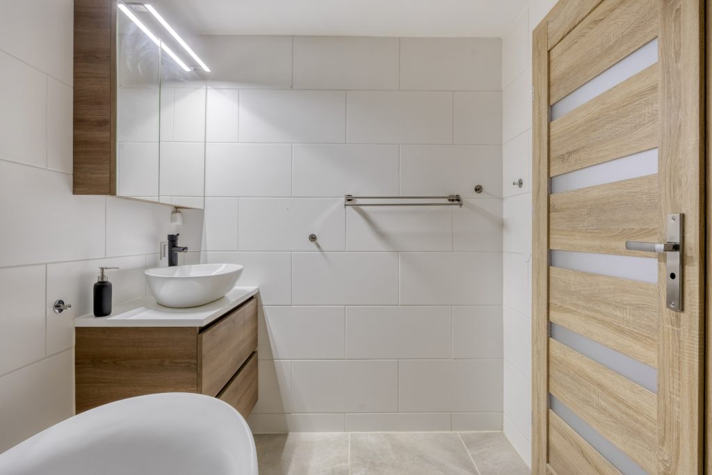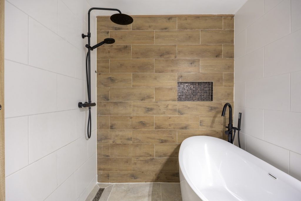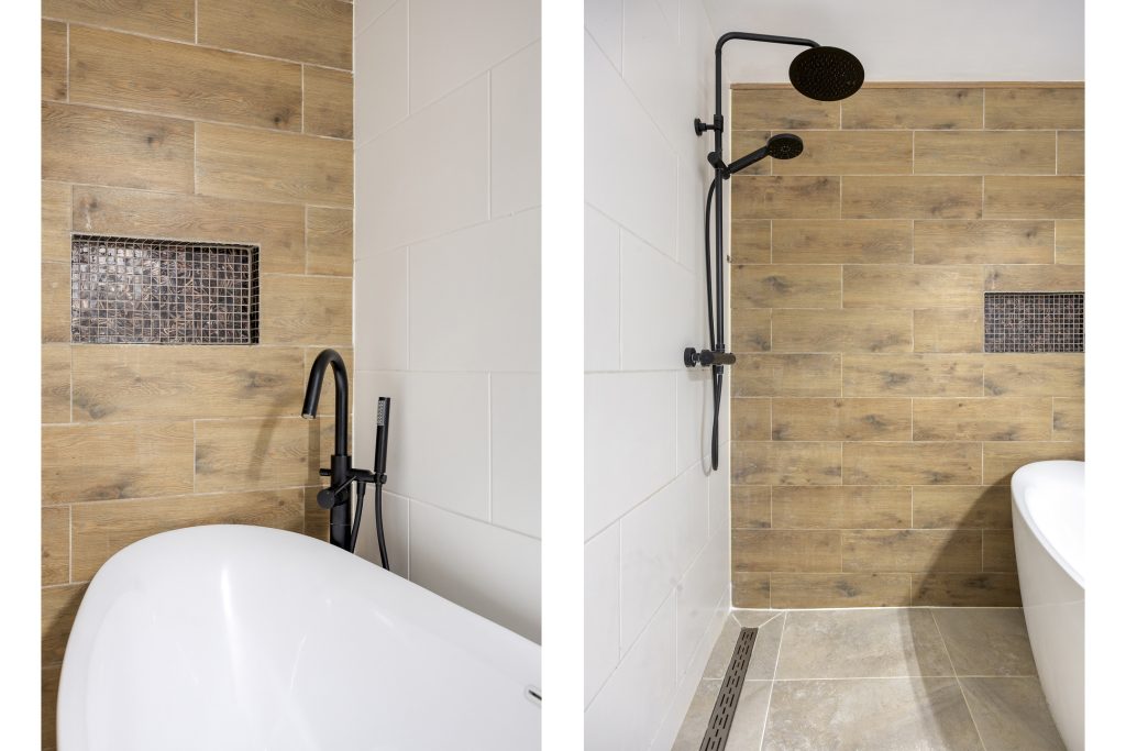 Luxe, royale betegelde badkamer voorzien van een badmeubel met waskom, grote inloopdouche met rainshower, drain en thermostaatkraan, ligbad en inbouwspots.