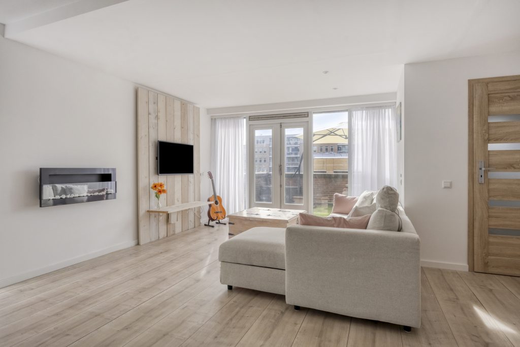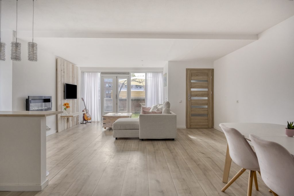 Sfeervolle woonkamer met openslaande terrasdeuren en ruim zicht op het dakterras; de woonkamer is afgewerkt met een fraaie laminaatvloer met laminaatvloer en stucwerk wand- en plafondafwerking.