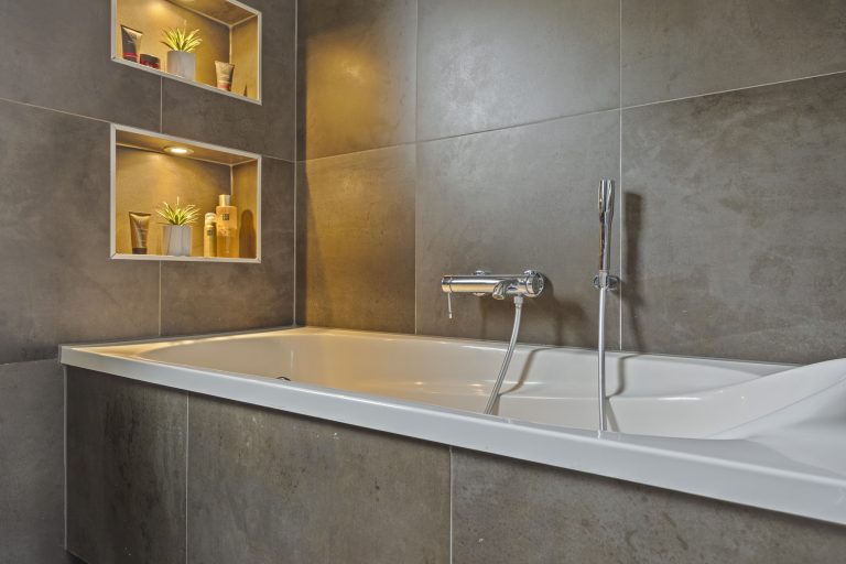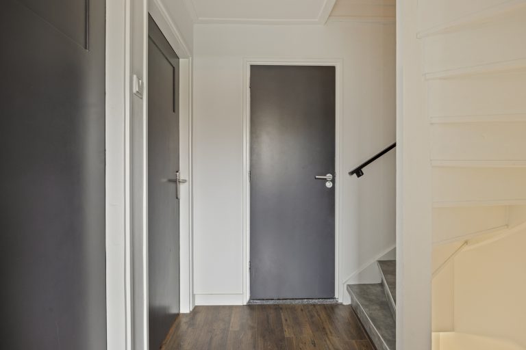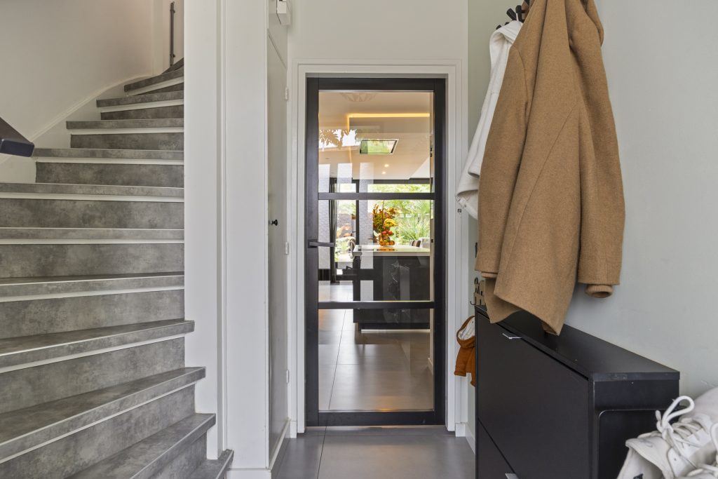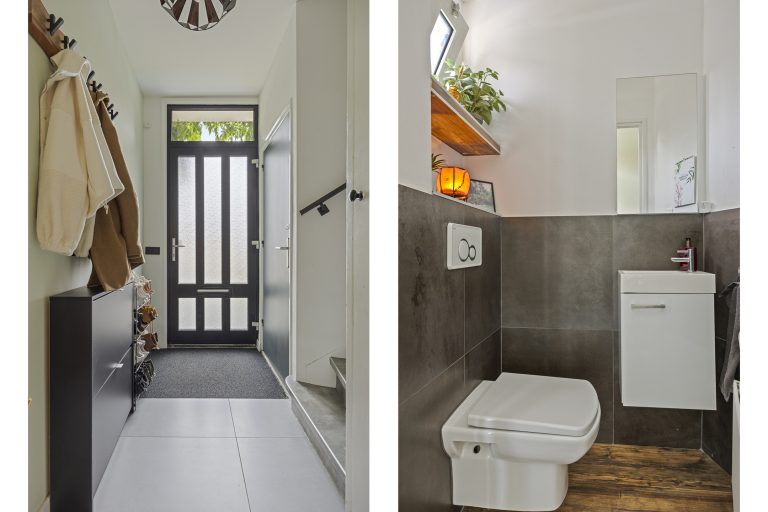 Via een pad door de nette voortuin bereikt u de overdekte entree van de woning. De hal is voorzien van een tegelvloer met vloerverwarming, een garderobe, meterkast en trapopgang naar de eerste verdieping. De moderne toiletruimte is deels betegeld en gestuukt en beschikt over een wandcloset en fonteintje.