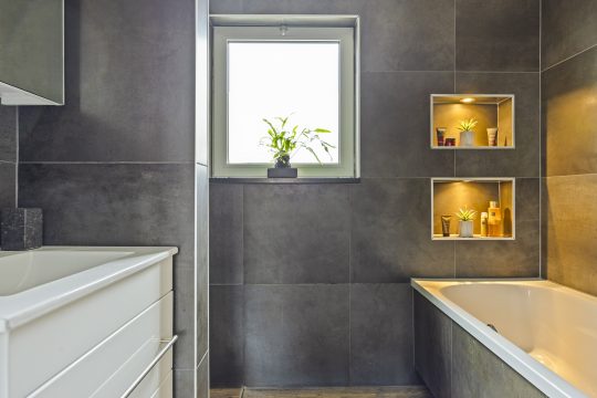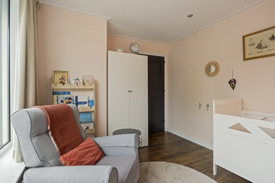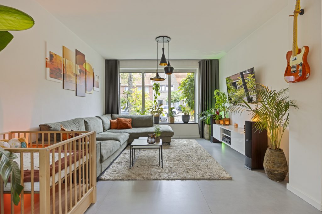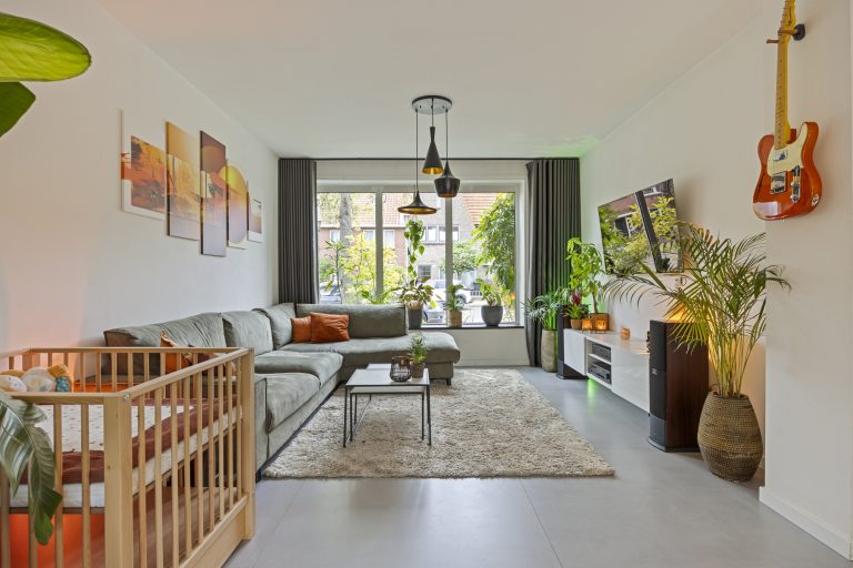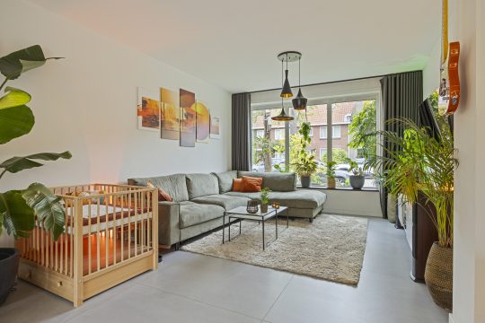 De ruime woonkamer heeft veel daglichttoetreding door het grote raamkozijn aan de voorzijde. De vloer is afgewerkt met tegels met vloerverwarming en de wanden en het plafond zijn gestuukt.