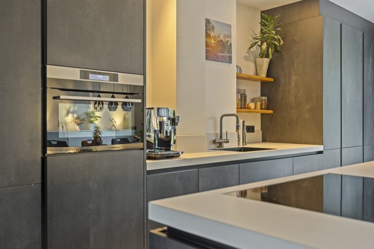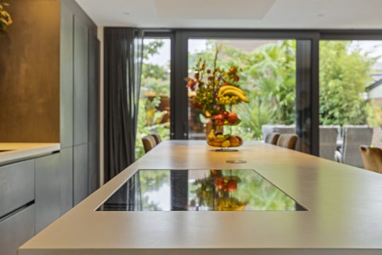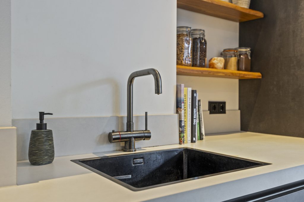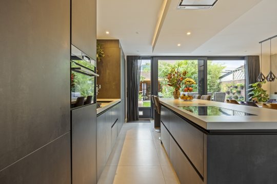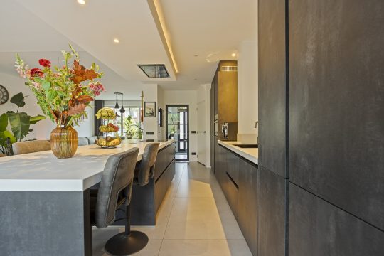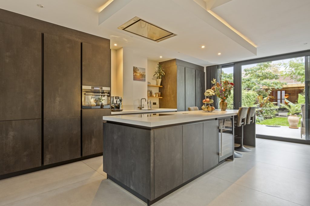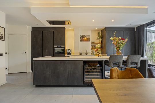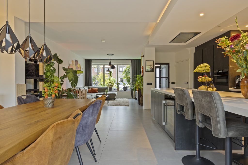 De open woonkeuken vormt het hart van de woning. De luxe keukeninrichting beschikt over een kastenwand met koelkast, vriezer en combi-oven, een aanrecht met spoelbak en Quooker, en een tweede kastenwand met apothekerskast. Het kookeiland is voorzien van een inductiekookplaat, wijnklimaatkast en een eetgedeelte met bar. Vanuit de keuken en eetkamer is er middels een loopdeur en een brede schuifpui toegang tot de tuin.