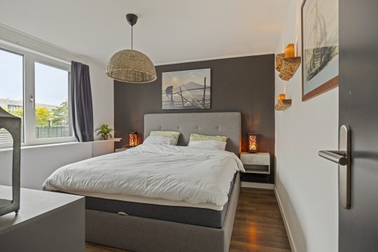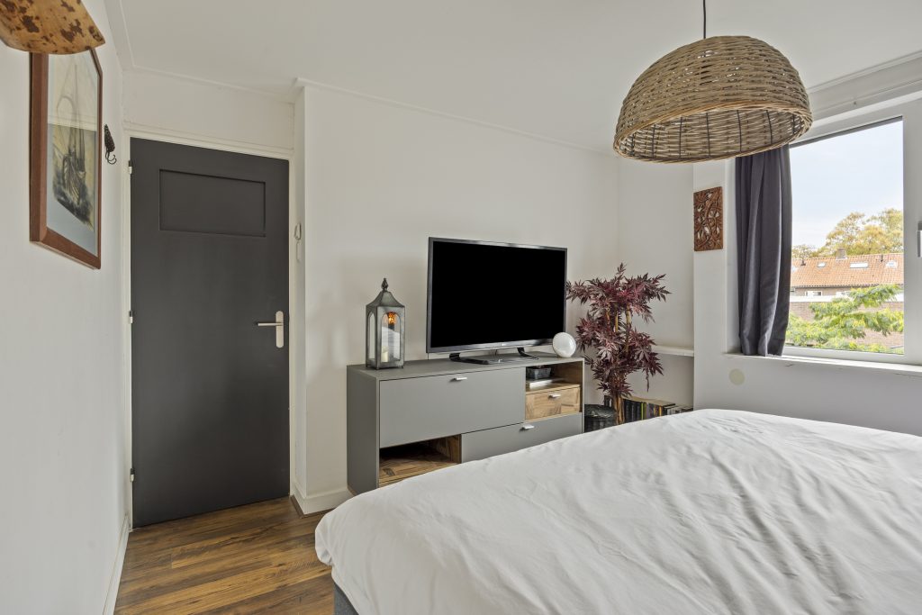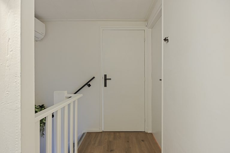 Via de overloop met laminaatvloer is er toegang tot drie slaapkamers en de badkamer, evenals de trapopgang naar de tweede verdieping. Slaapkamer één is een ruime kamer aan de voorzijde van de woning. Slaapkamer twee bevindt zich aan de achterzijde en is afgewerkt met een laminaatvloer en gestuukte wanden en plafond. Slaapkamer drie ligt eveneens aan de achterzijde, is voorzien van een vaste kast en heeft een deur naar het platte dak. Alle slaapkamers zijn afgewerkt met laminaatvloeren, gestuukte wanden en plafonds en beschikken over elektrische rolluiken. De moderne badkamer is geheel betegeld en voorzien van een ligbad, een wastafelmeubel en een inloopdouche met regendouche.
