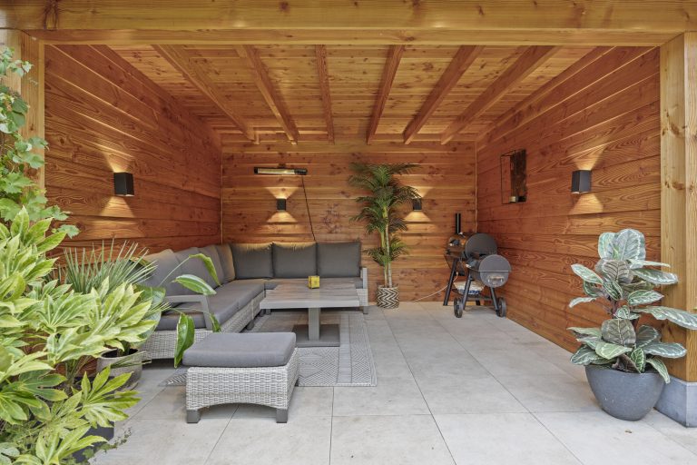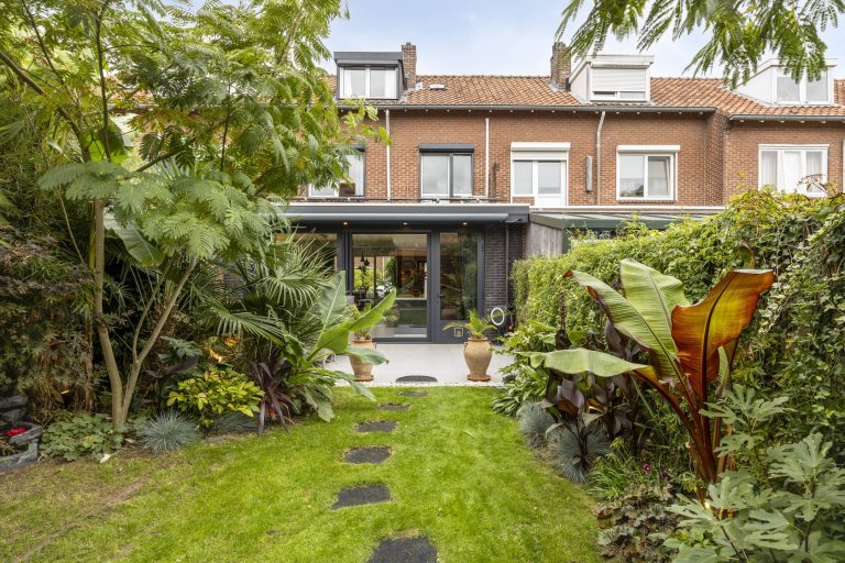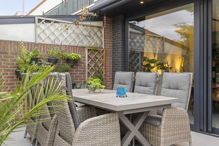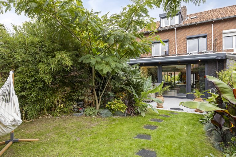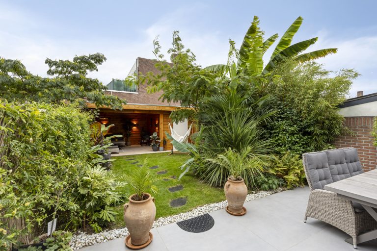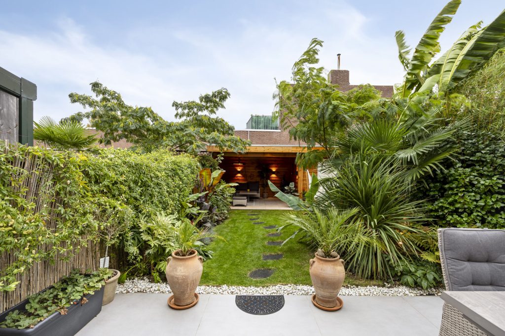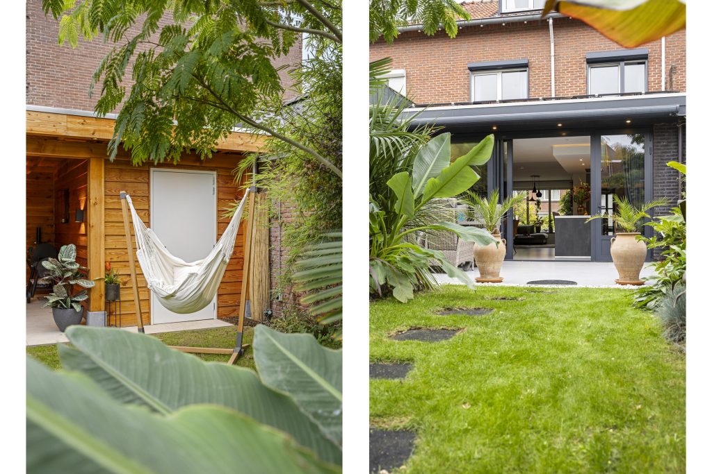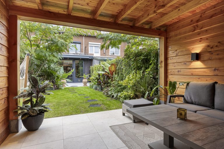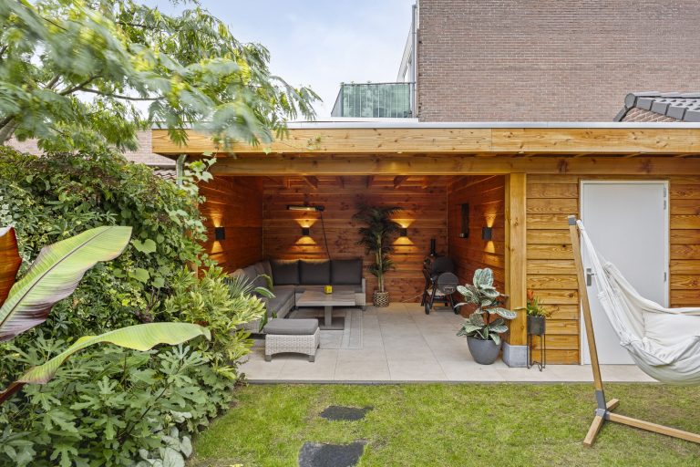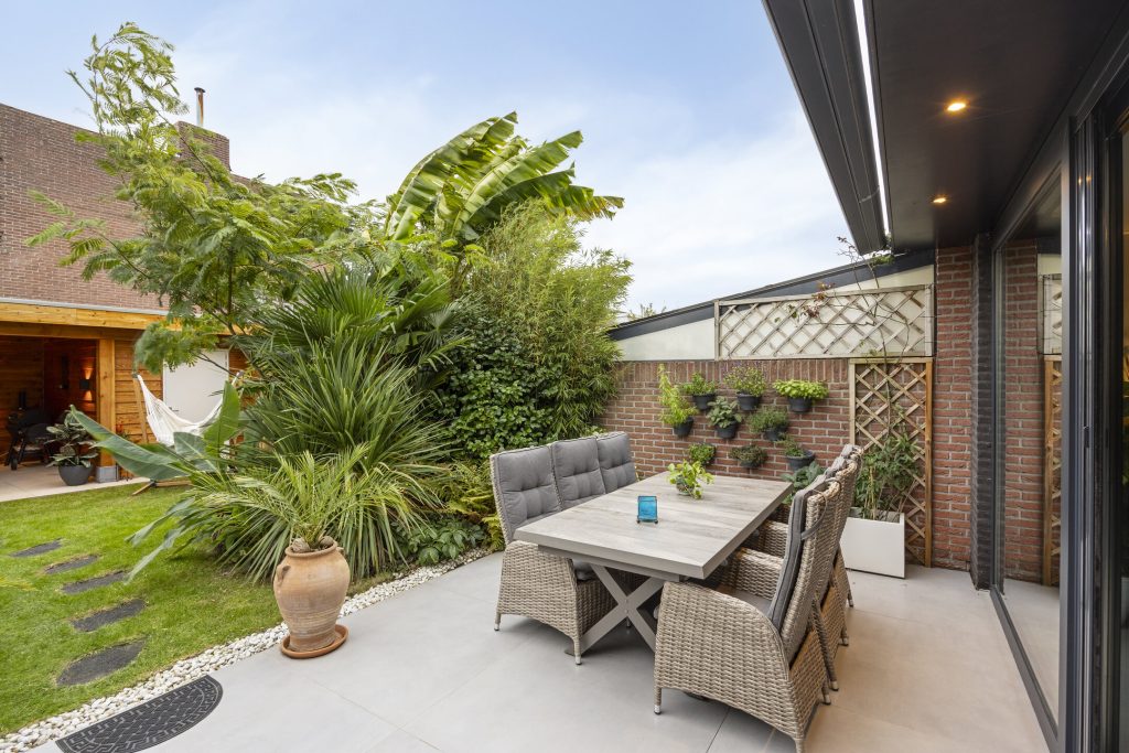 * Verzorgde achtertuin met terras, praktische overkapping en berging