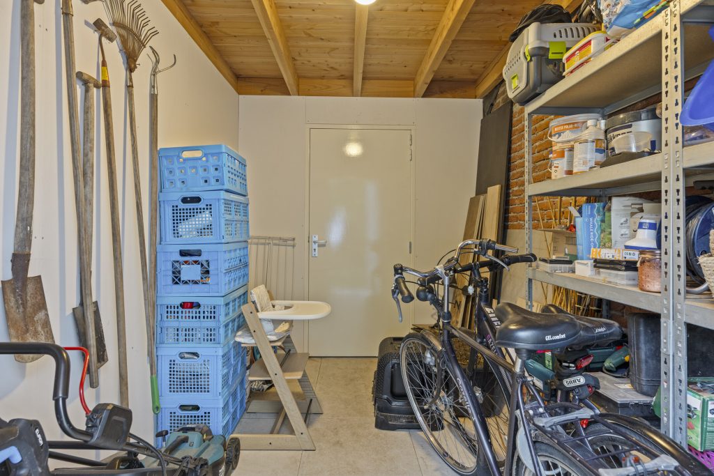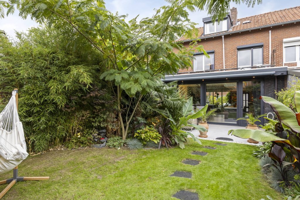 De achtertuin biedt veel privacy en beschikt over een terras, een gazon en beplanting. Aan de achterzijde van de tuin bevindt zich een overkapping met aangrenzende berging en achterom.
