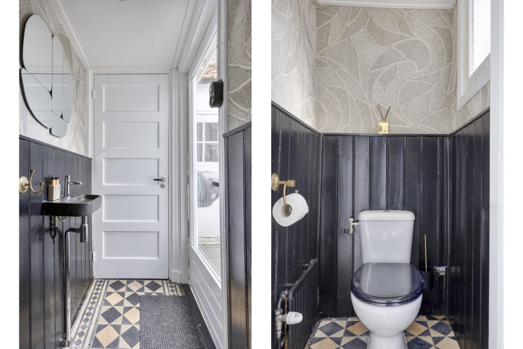 De toiletruimte is voorzien van een staand closet, lambrisering, tegelvloer en een wc-raampje.