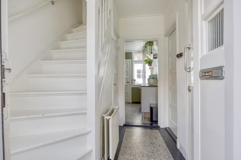 De hal is voorzien van een karakteristieke granito vloer en biedt toegang tot de meterkast, verdiepte kelderkast, keuken en de sfeervolle living.