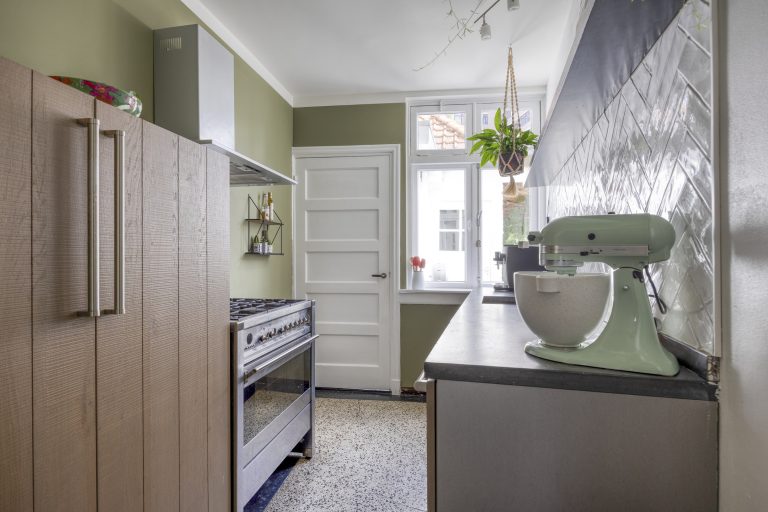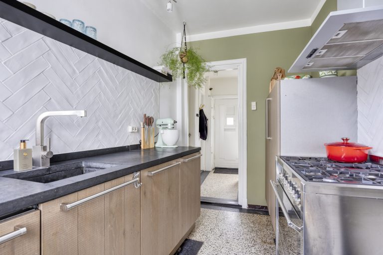 Ruime separate keuken met opstelling uitgevoerd met een natuurstenen blad, spoelbak, vaatwasser, 8-pits gasfornuis met extra brede oven, afzuigschouw en koelkast. Vanuit de keuken toegang tot een 2e hal met fonteintje en toegang tot de toiletruimte en de achtertuin.