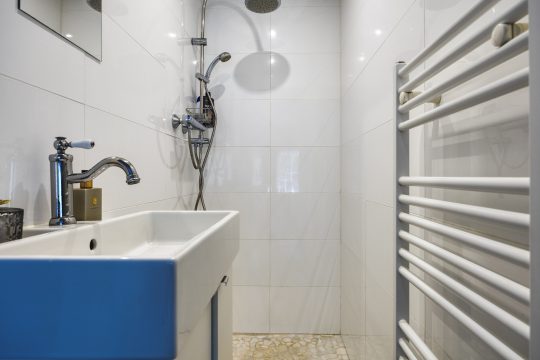 Geheel betegelde badkamer voorzien van inloopdouche, wastafel met bijpassend meubel en een designradiator.