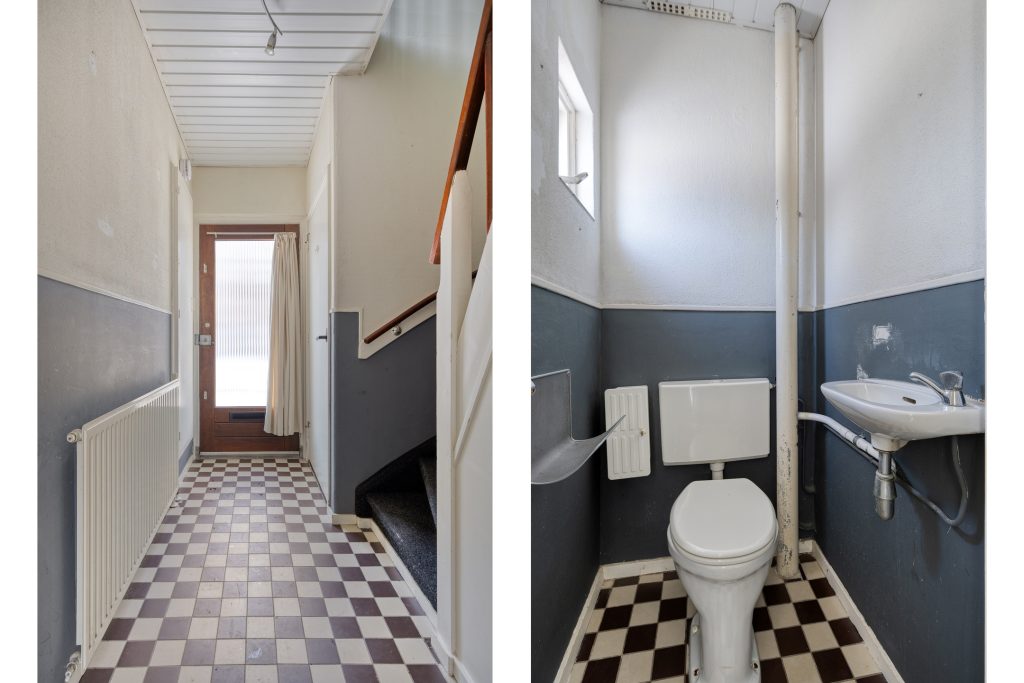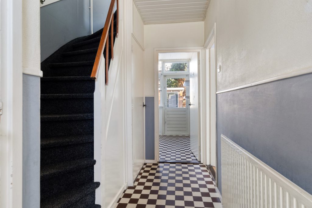 Entree met meterkast, trapopgang naar de eerste verdieping en toegang tot het toilet en de woonkamer. In de hal bevindt zich tevens een verdiepte kelderkast met wateraansluiting.
