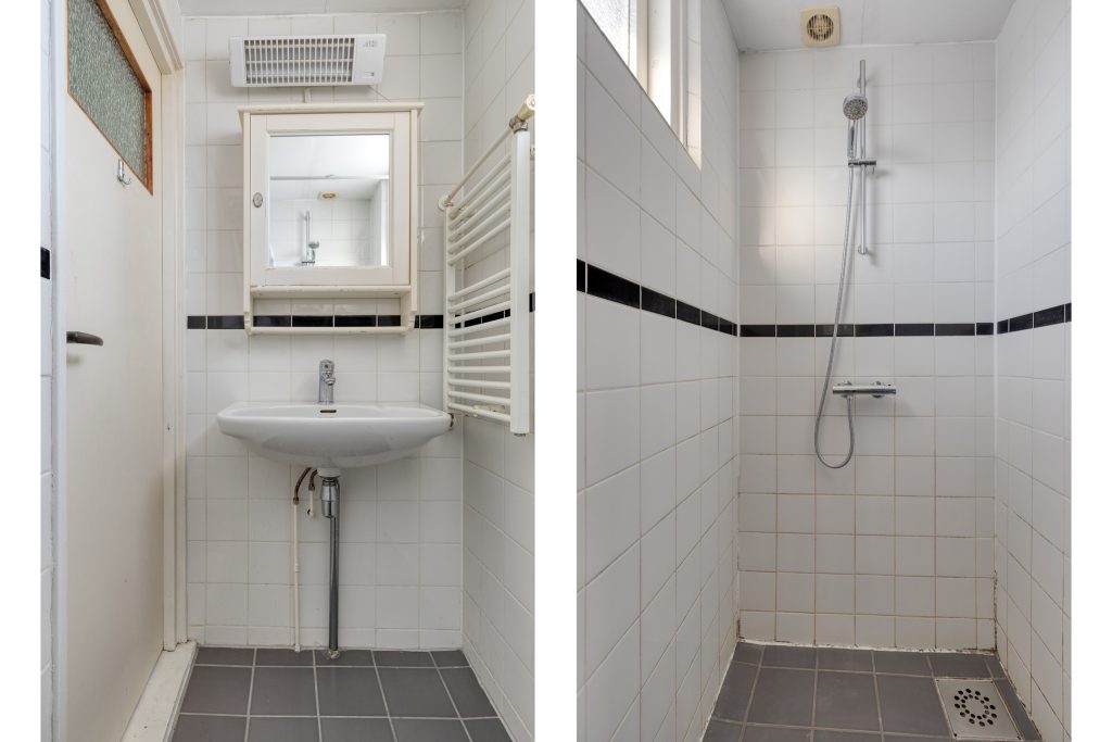 Badkamer voorzien van inloopdouche, vaste wastafel en designradiator. De badkamer beschikt over houten kozijnen.