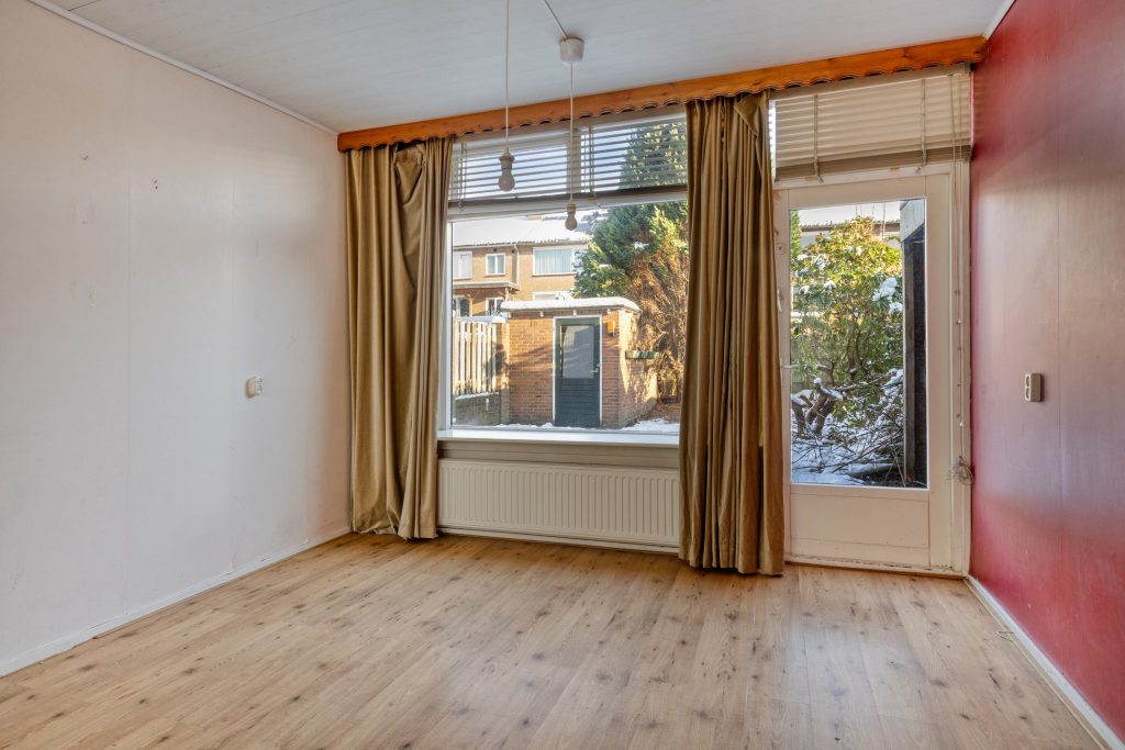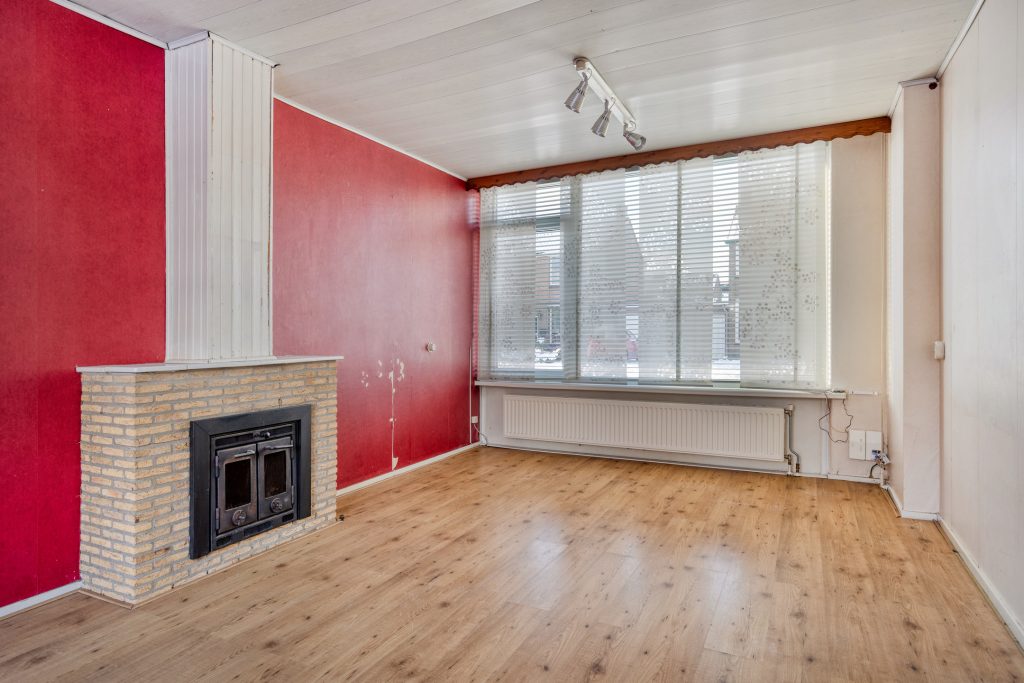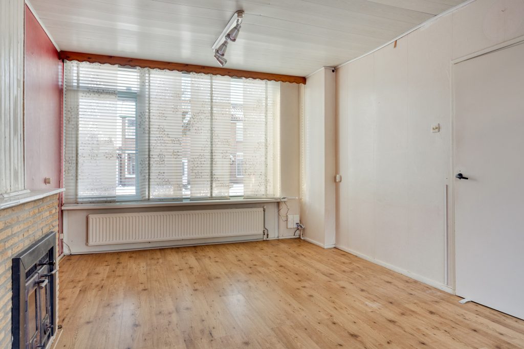 Doorzonwoonkamer met een laminaatvloer. Aan de voorzijde is de woning voorzien van kunststof kozijnen met dubbele beglazing. Aan de achterzijde zijn houten kozijnen aanwezig. In de woonkamer bevindt zich een haard.