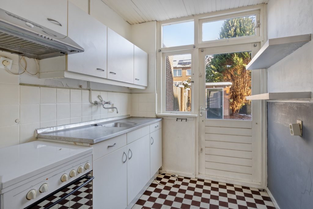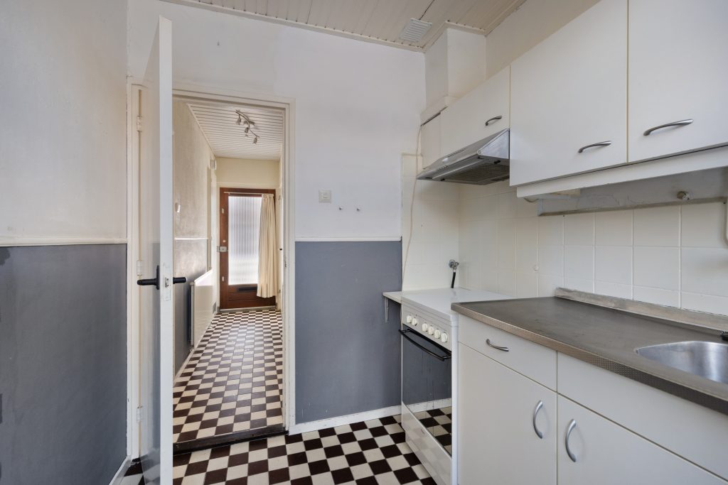 Gesloten keuken met keukenblok en afzuigvoorziening. De keuken heeft een betonnen vloer met tegelafwerking en biedt directe toegang tot de achtertuin.