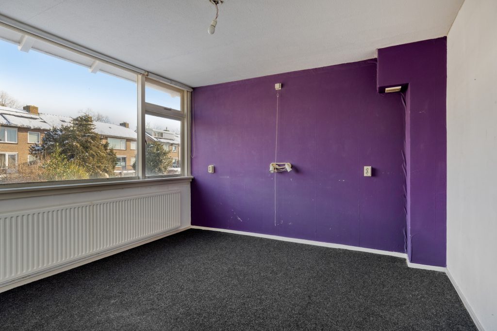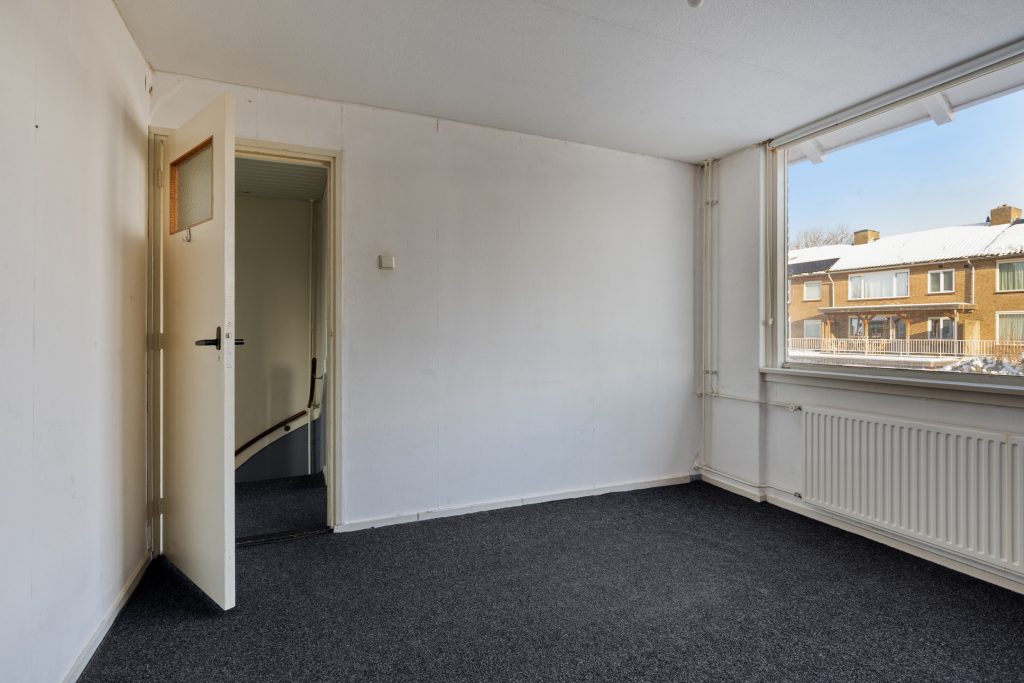 Slaapkamer 2: Gelegen aan de achterzijde, met vloerbedekking en houten kozijnen.