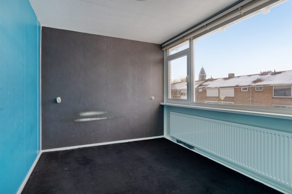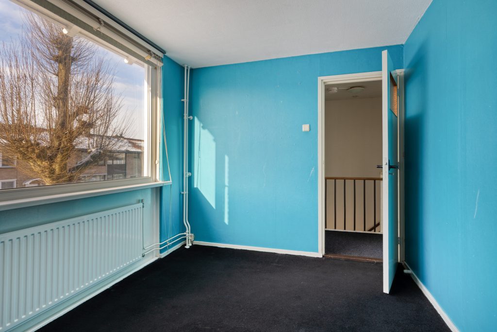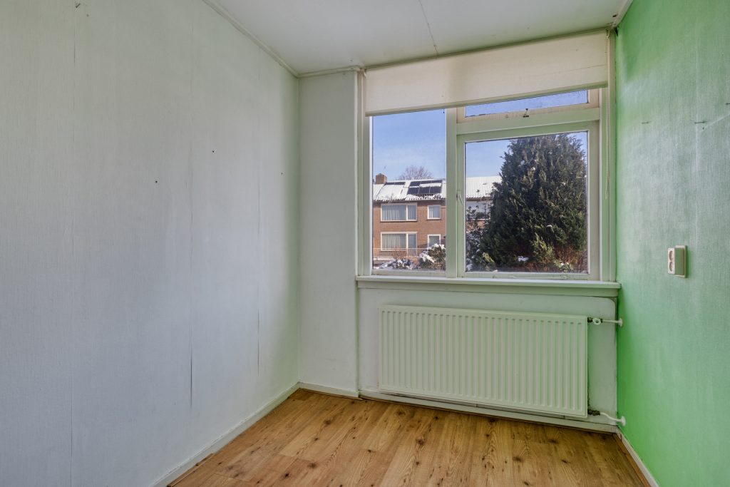 Slaapkamer 3: Eveneens aan de achterzijde, voorzien van laminaatvloer. In deze kamer is een deel van het rookkanaal zichtbaar.