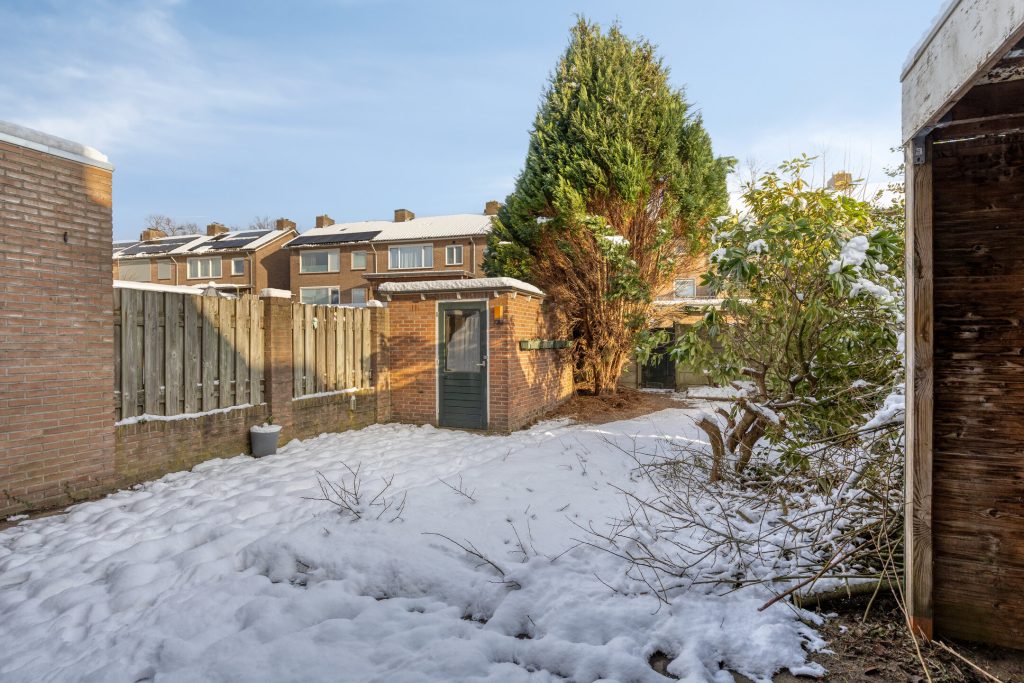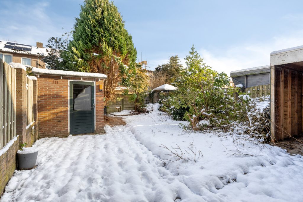 Zeer brede, volledig omsloten achtertuin met een berging, achterom en veel privacy. Het royale perceel biedt volop mogelijkheden voor uitbouw, terrassen of een grote tuinindeling.