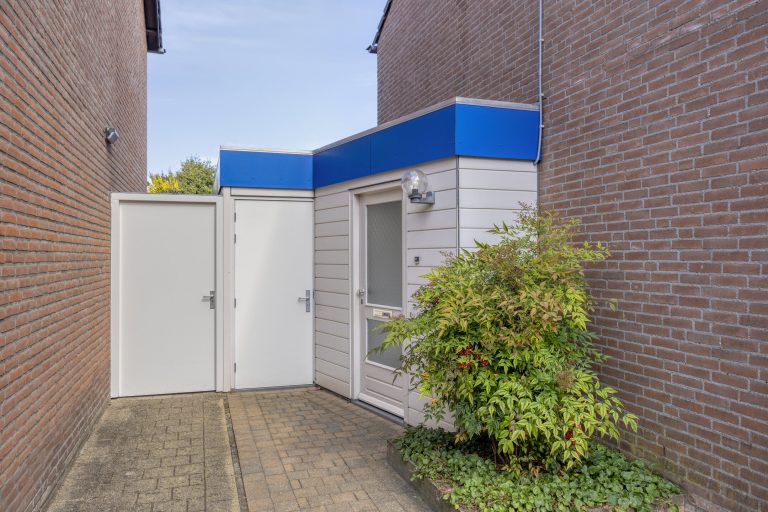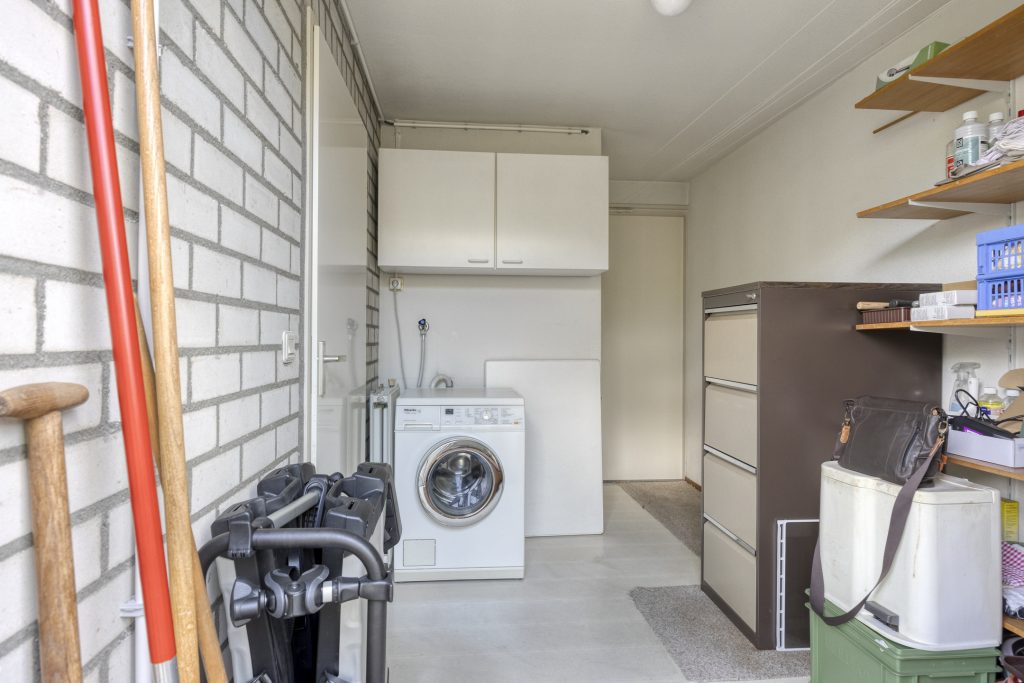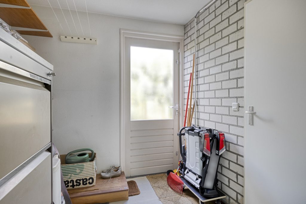 Praktische berging c.q. bijkeuken met aansluiting wasapparatuur en met toegang tot de voor- en achtertuin.