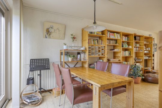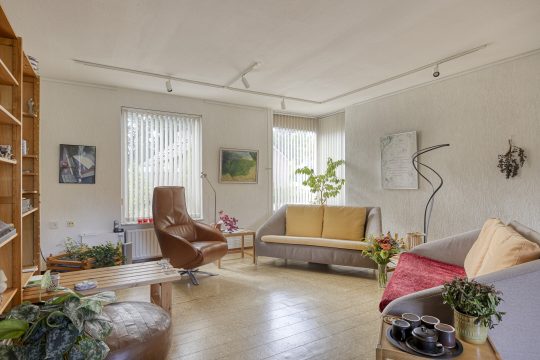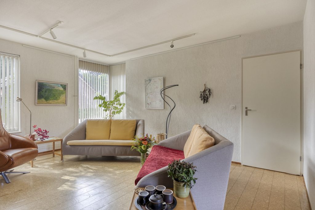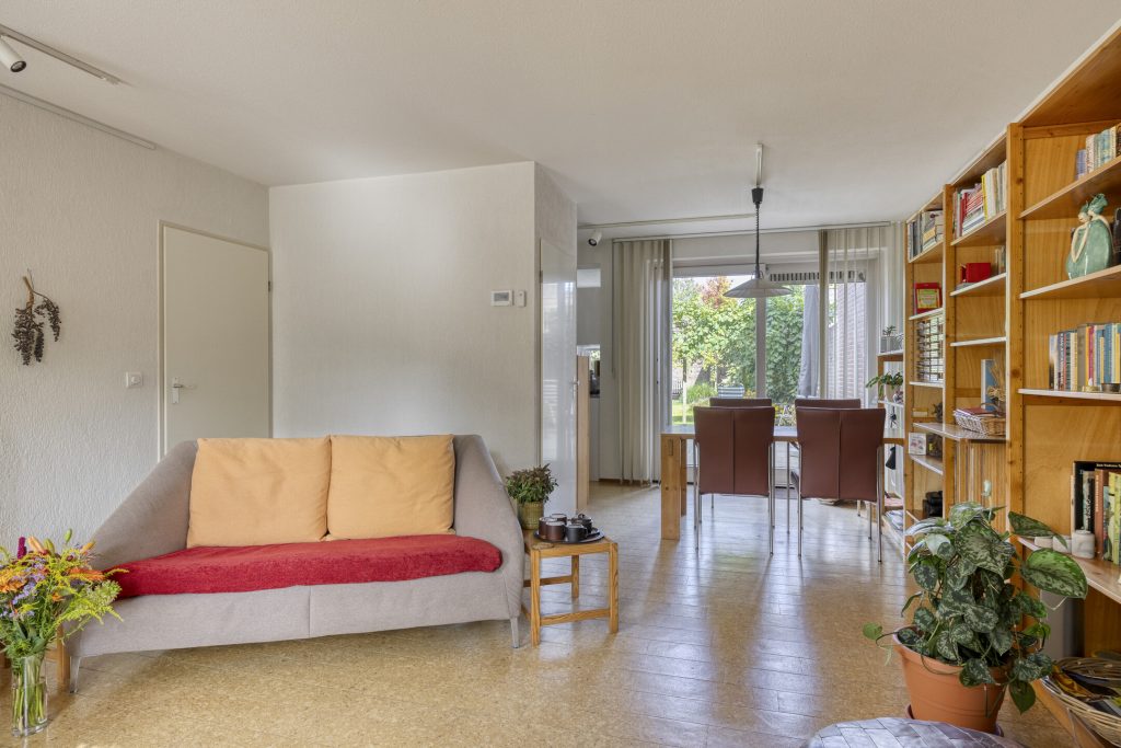 Lichte woonkamer voorzien van een schuifpui met toegang tot de achtertuin, trapkast en tevens toegang tot de keuken. De woonkamer is afgewerkt met een kurkvloer, spachtelputz wandafwerking en stucwerk plafondafwerking.