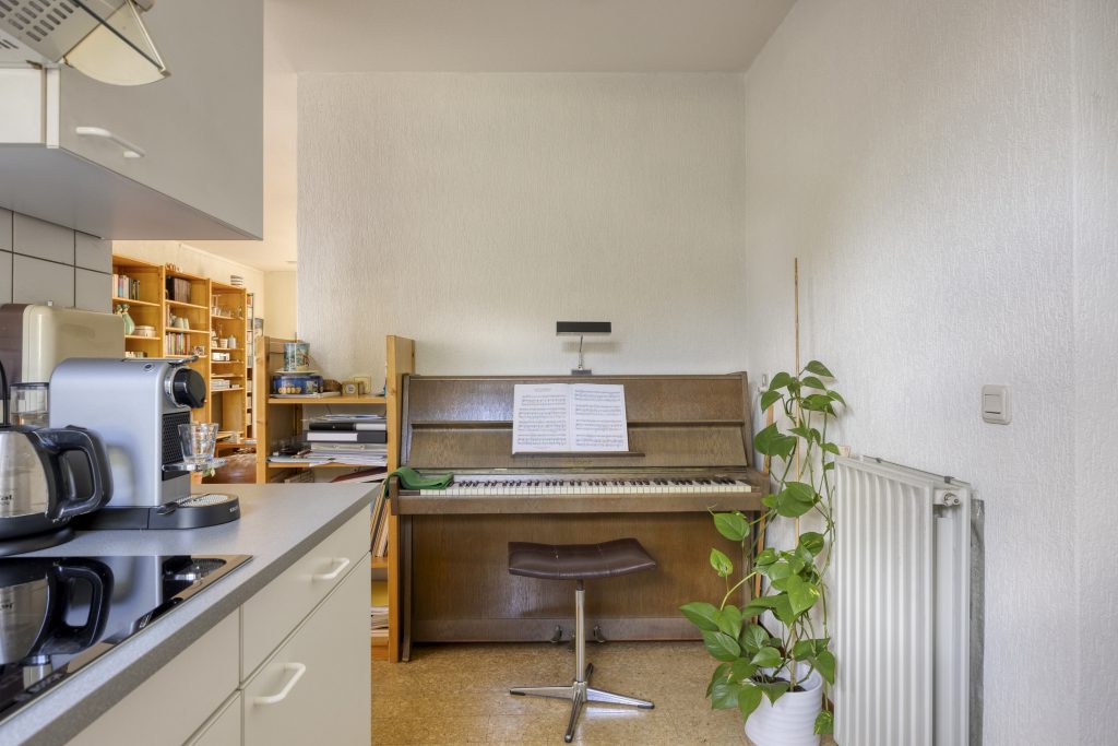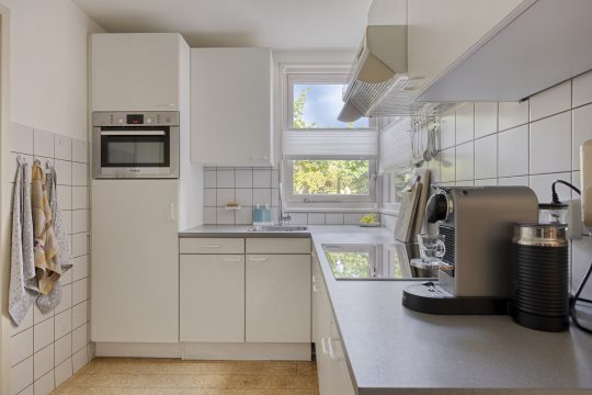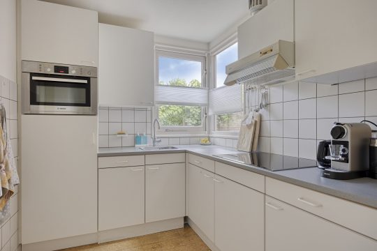 Nette, open keuken in hoekopstelling voorzien van een koelkast (met vriesvak), combi-oven, inductiekookplaat, afzuigkap, spoelbak met mengkraan en kunststof aanrechtblad. Vanuit de keuken heeft u middels een deur toegang tot de inpandige berging/bijkeuken.