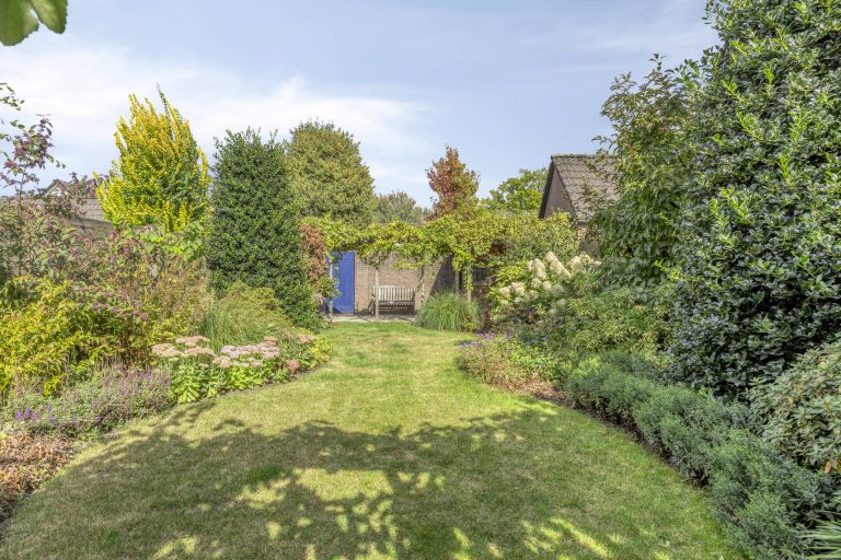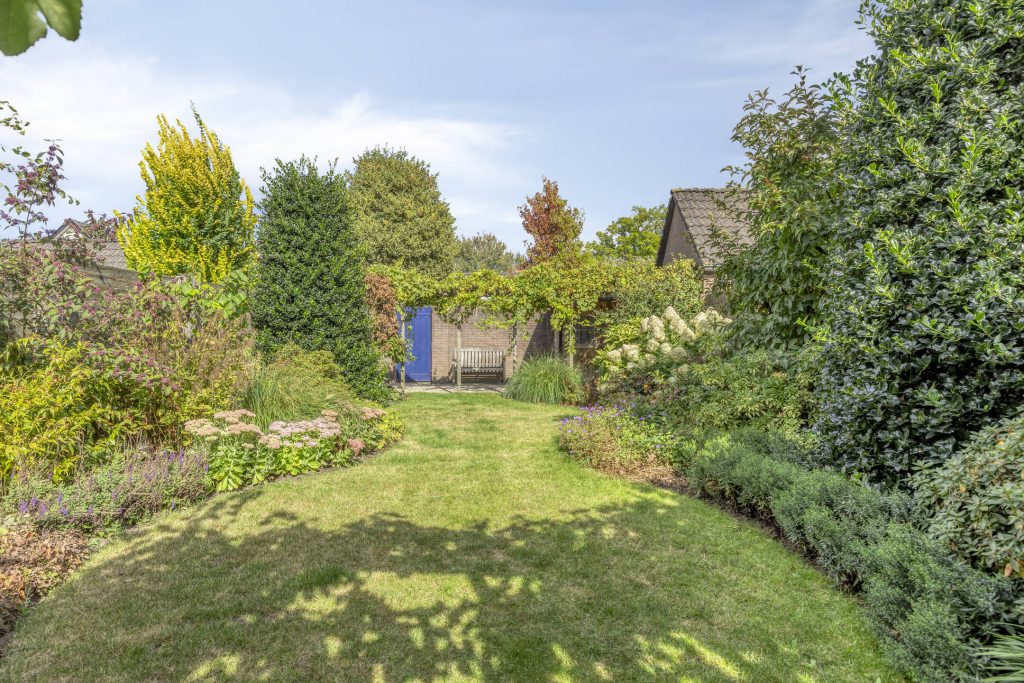 Fraai aangelegde ruime, diepe achtertuin op zonzijde met terras, gazon, vaste beplanting, houten/stenen schuttingen, vrijstaande berging en afsluitbare achterom.