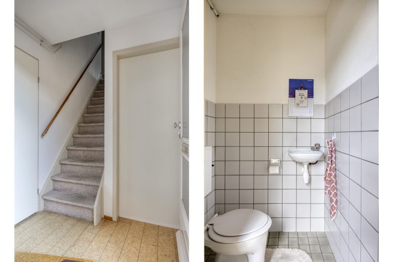 Hal met trapopgang en toegang tot toilet, meterkast en de woonkamer.