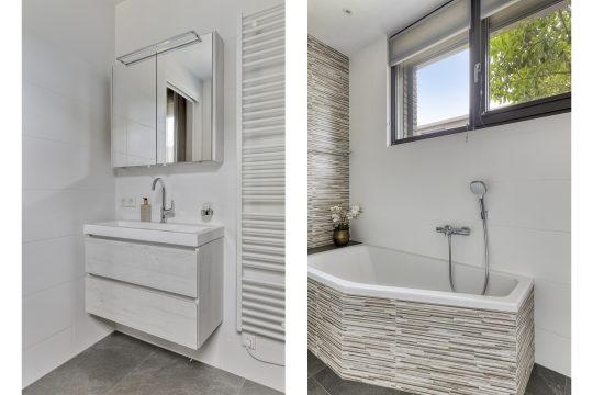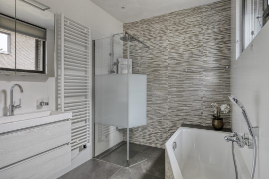 Moderne badkamer welke is voorzien van een wastafel met bijpassend meubel, spiegelkastje met verlichting, designradiator, inloopdouche met Sun shower en een ligbad. De badkamer is geheel betegeld en voorzien van een dubbele raampartij met rolluiken en een stucwerk plafond met inbouwverlichting.