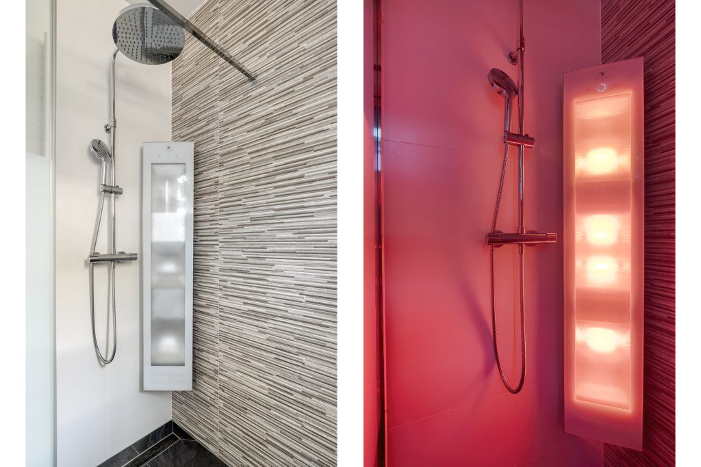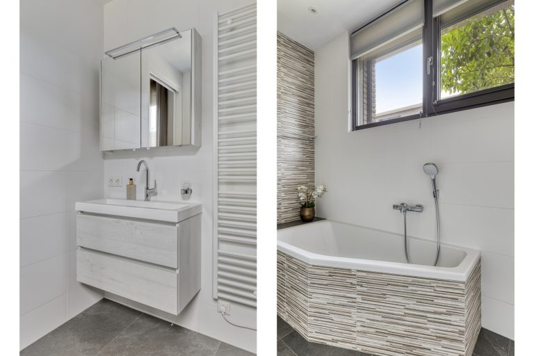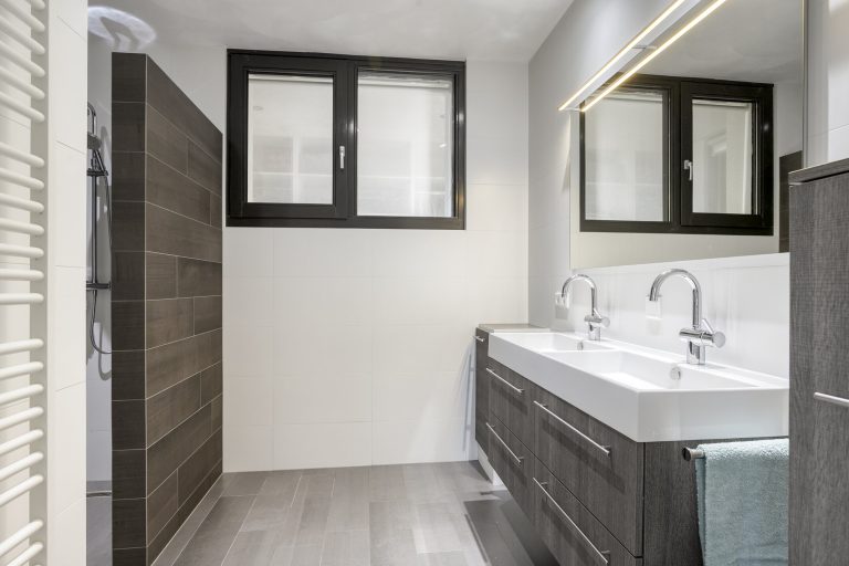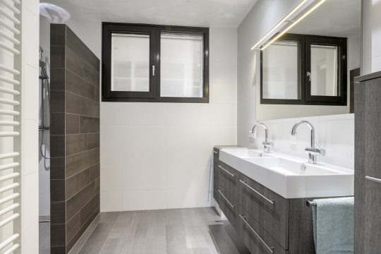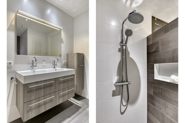 Moderne badkamer voorzien van ruime inloopdouche, dubbele wastafel met bijpassend meubel en spiegel met inbouwverlichting, badkamerkast, waskoker, designradiator, voldoende elektrapunten en raampartij.