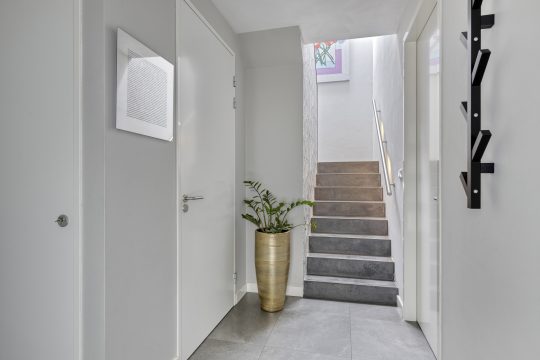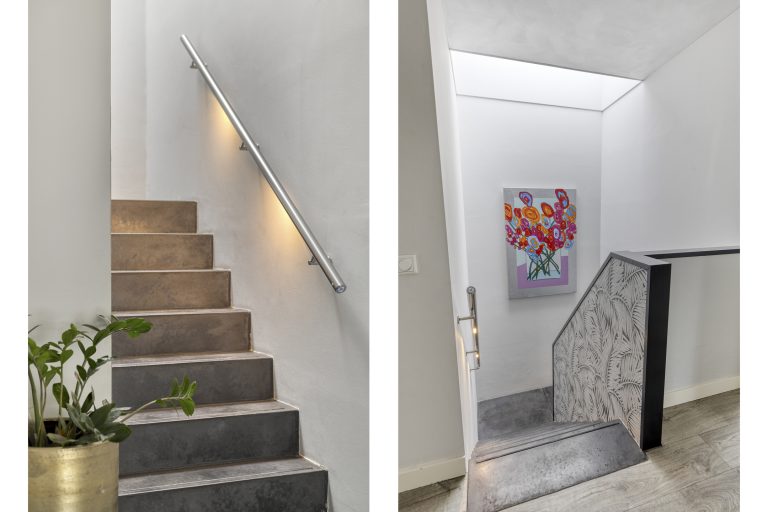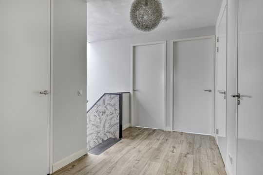 Vanuit de fraaie betonnen trapopgang toegang tot de riante overloop welke toegang biedt tot alle ruimtes. De trapopgang geniet van een natuurlijke lichtinval door de geplaatste lichtstraat en is verder voorzien van sfeerverlichting in de trapleuning.