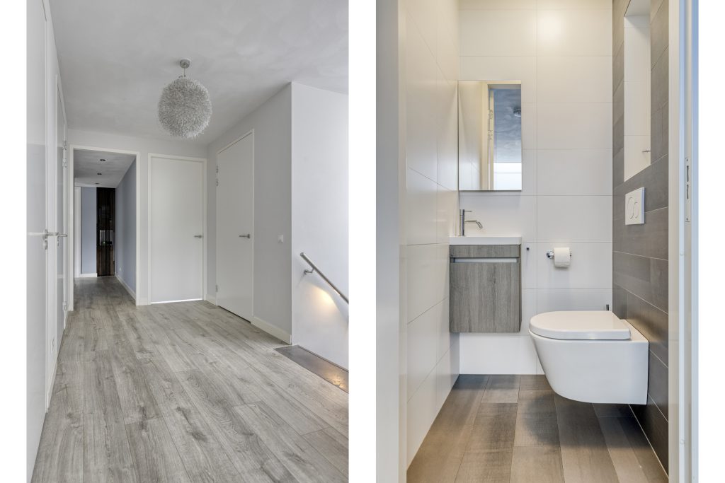 Moderne separate toiletruimte welke is voorzien van een zwevend toilet en fonteintje met bijpassend meubel en spiegel. De toiletruimte is geheel betegeld en tevens voorzien van nis.