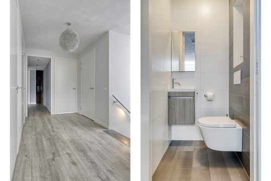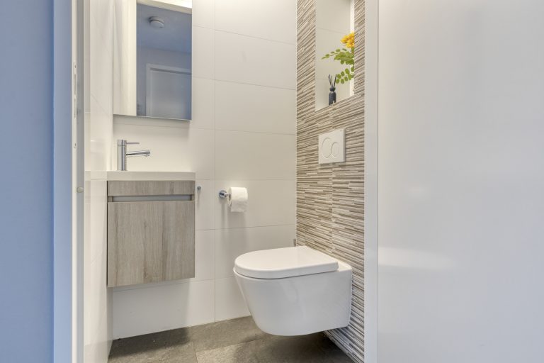 Moderne toiletruimte welke is voorzien van een zwevend closet, fonteintje met warm/koud water en bijpassend meubel en een spiegel. De toiletruimte is volledig betegeld en voorzien van een nis.